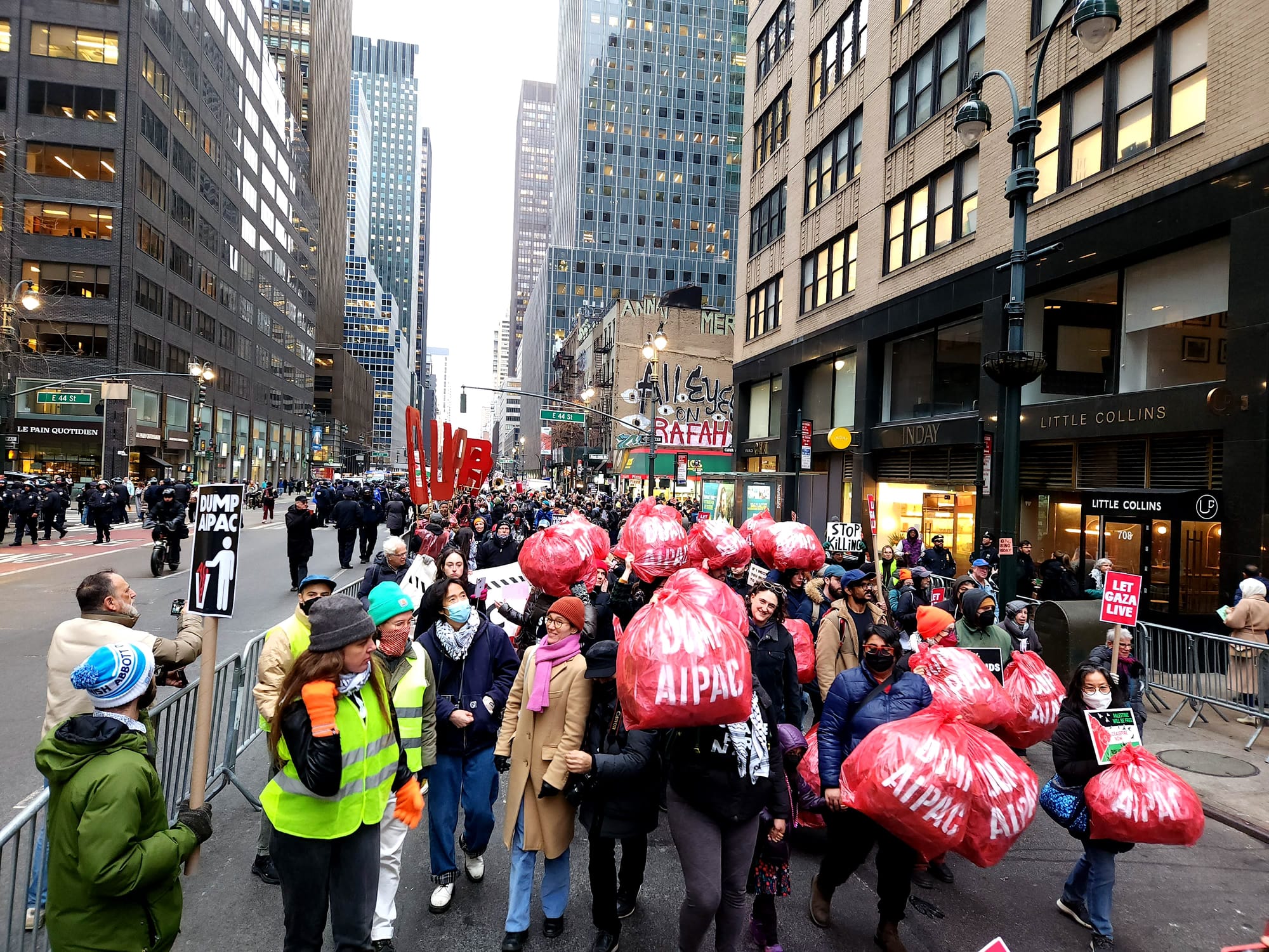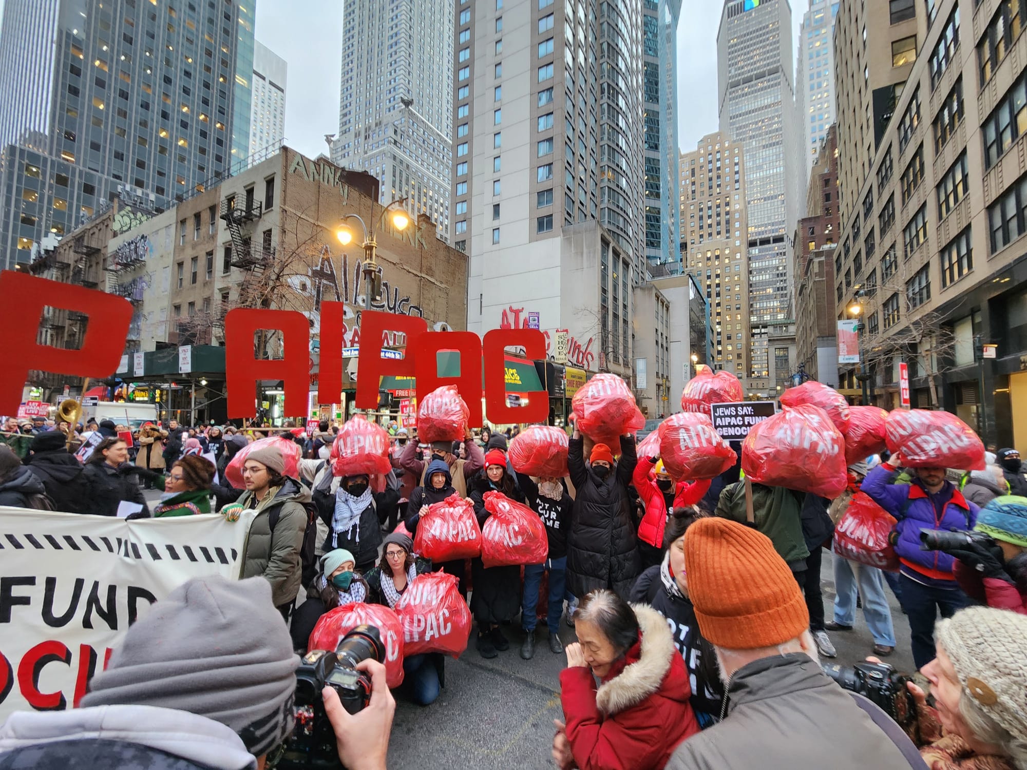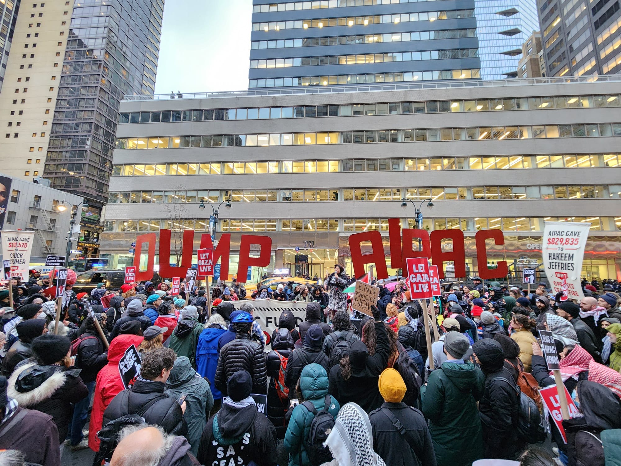 With enormous red-painted cardboard letters reading "DUMP AIPAC" as well as a frontal banner emblazoned with the phrase "AIPAC funds genocide," the march swept noisily along three streets and one avenue under a light but freezing drizzle before landing at the organization's headquarters.