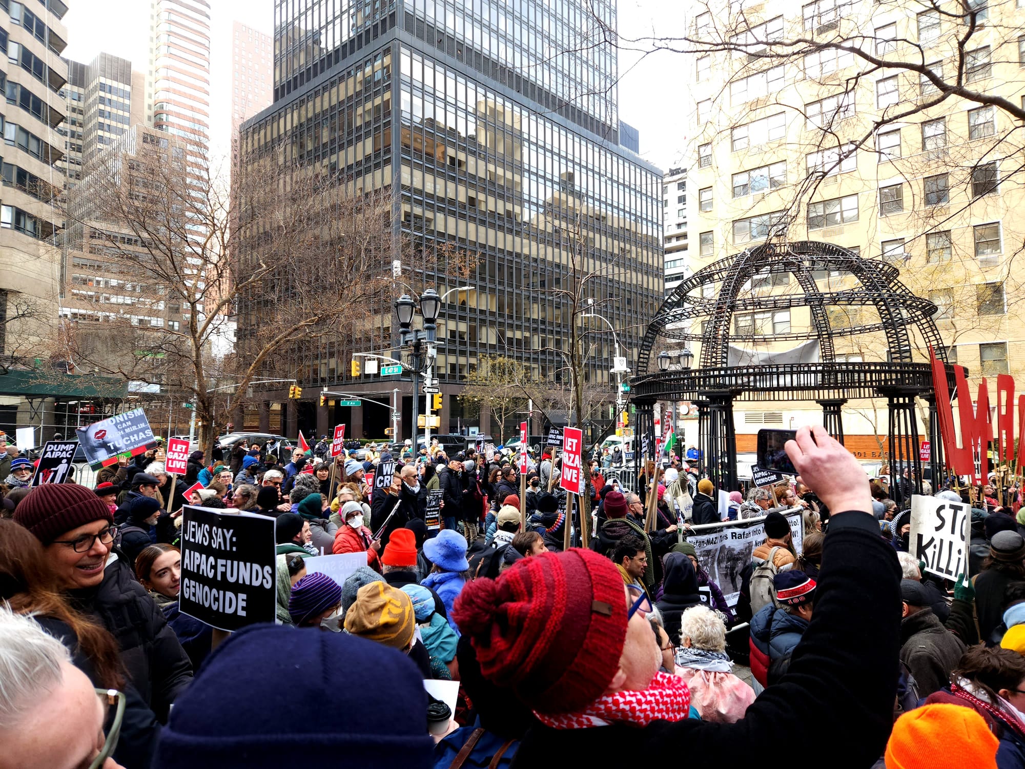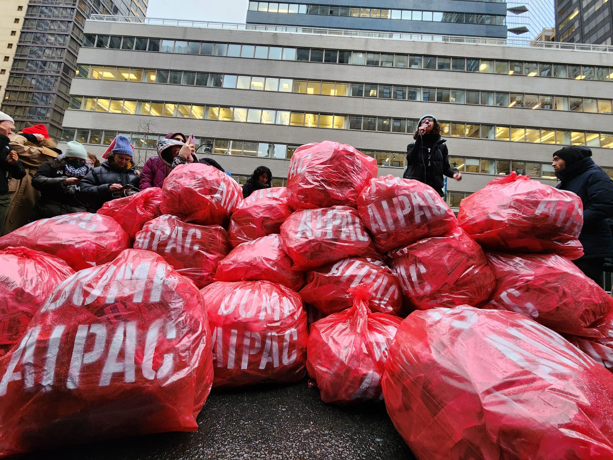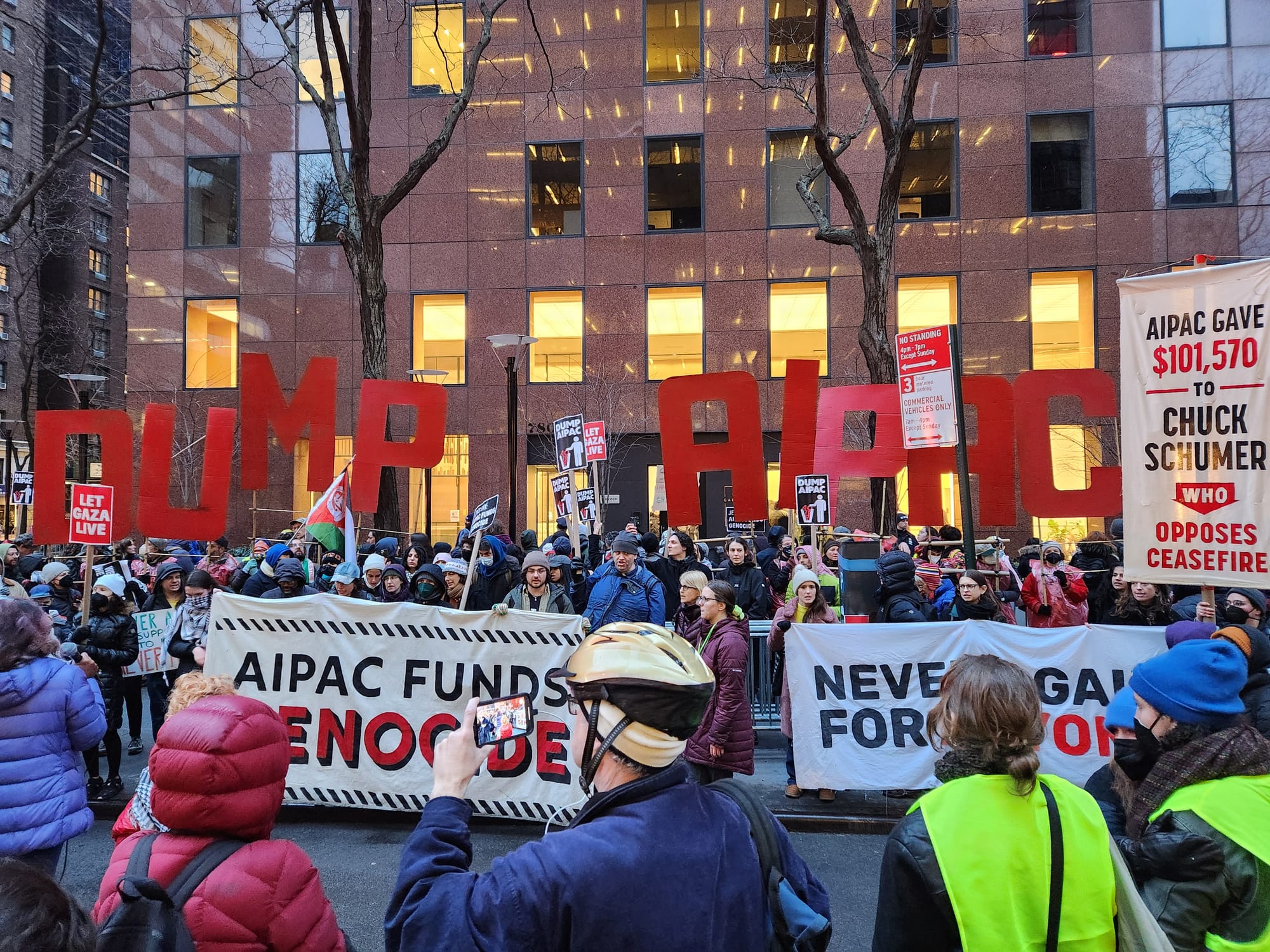 With enormous red-painted cardboard letters reading "DUMP AIPAC" as well as a frontal banner emblazoned with the phrase "AIPAC funds genocide," the march swept noisily along three streets and one avenue under a light but freezing drizzle before landing at the organization's headquarters.