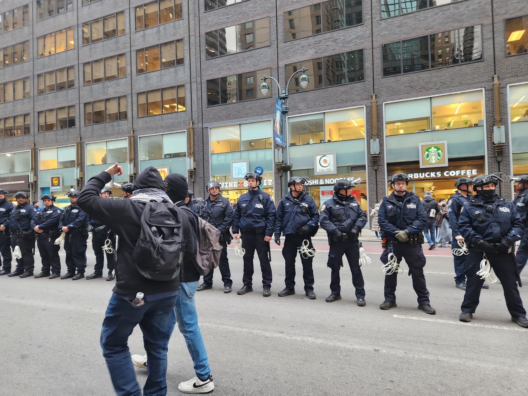 Hundreds of NYPD officers in riot gear were onsite to corral the march, threatening arrests if the organizers continued along the roads rather than confining the action to the sidewalks. JVP met them halfway by funneling the march to only block two lanes of traffic while organizers in fluorescent green vests lined up at intersections to protect the procession.