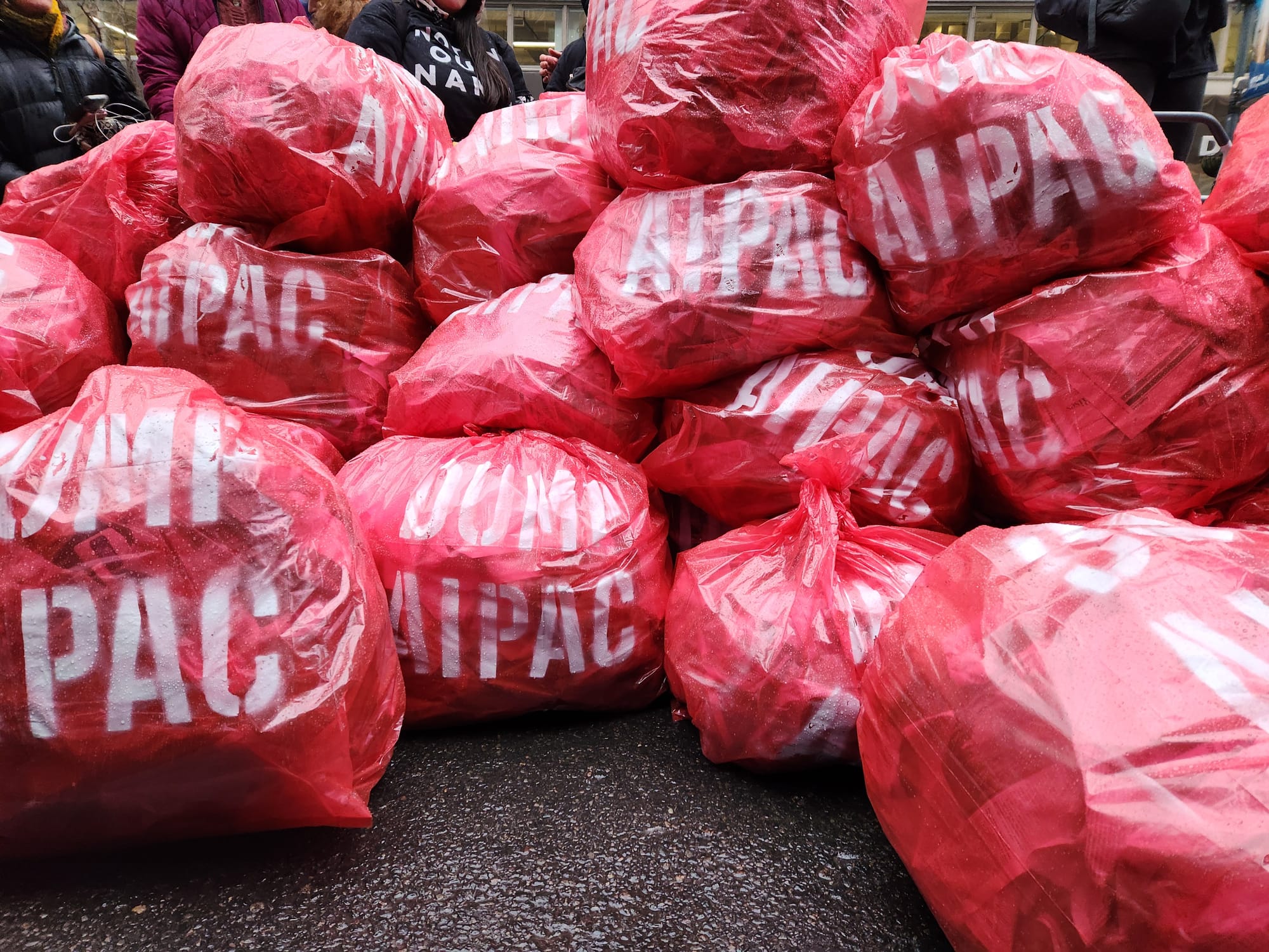 Thousands of Jewish Voice for Peace (JVP) organizers and allies marched over several blocks toward the American Israel Public Affairs Committee (AIPAC) headquarters in Midtown Manhattan on Thursday afternoon, February 22, protesting the lobbying organization's influence on politicians' opposition to a ceasefire in Gaza. Sparked by the United States's third consecutive veto of the United Nations Security Council's draft ceasefire resolution earlier this week, activists used bright-red trash bags demanding that New York officials "DUMP AIPAC" in a reinterpretation of the historic Young Lords "Garbage Offensive" of 1969.