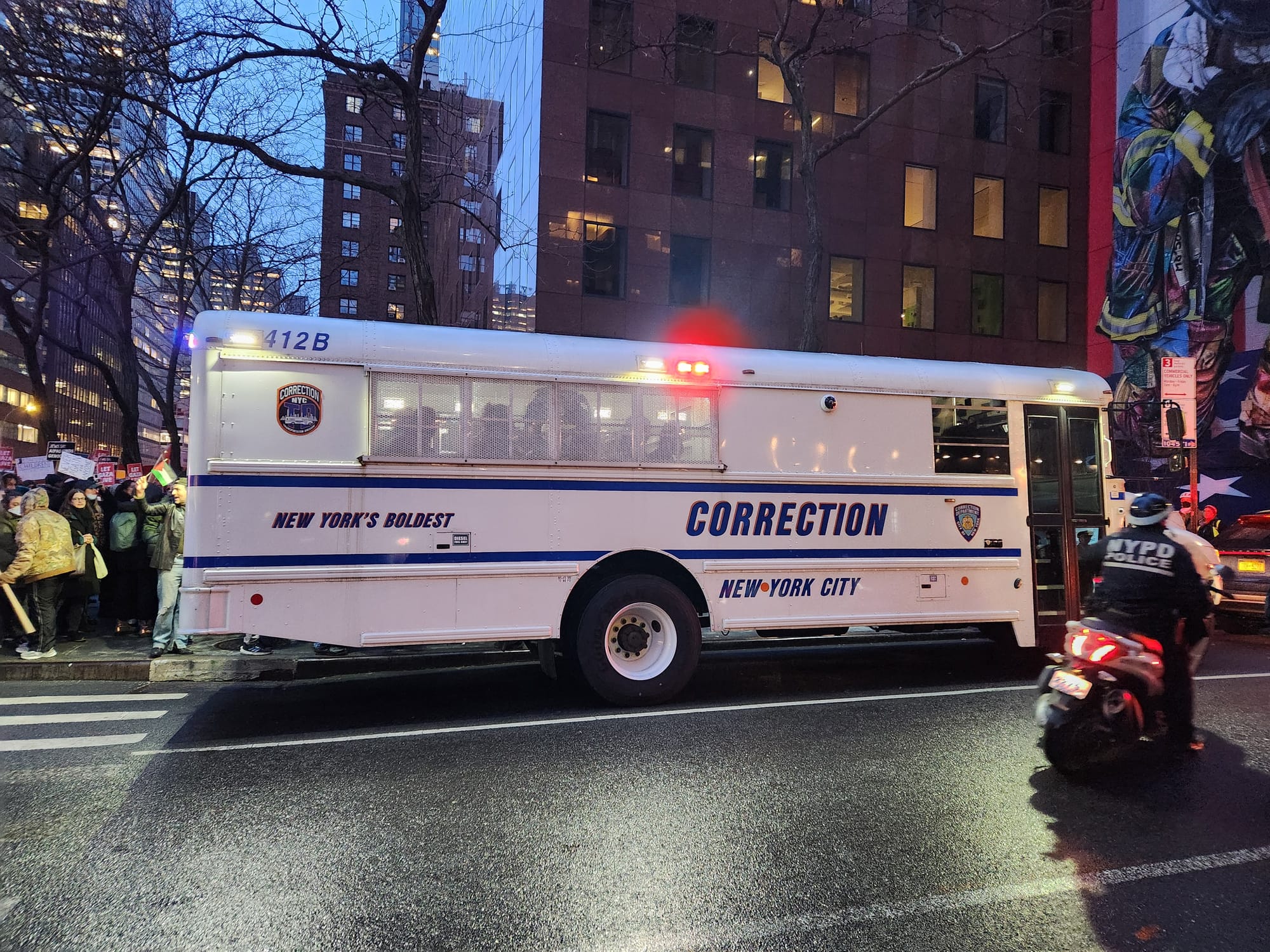 While the procession stalled outside of AIPAC's office past 5pm, 18 JVP protesters staged a sit-in inside Senator Schumer and Senator Gillibrand's office lobby, demanding that both parties reject AIPAC funding and call for a ceasefire now. Following a Jewish mourning ritual, the protestors placed 30 stones on the floor of the lobby to signify the loss of over 30,000 Palestinians. The march migrated to the office building shortly afterward, and NYPD began arresting the 18 protesters by 5:30pm, escorting them out of the lobby and into a corrections bus.