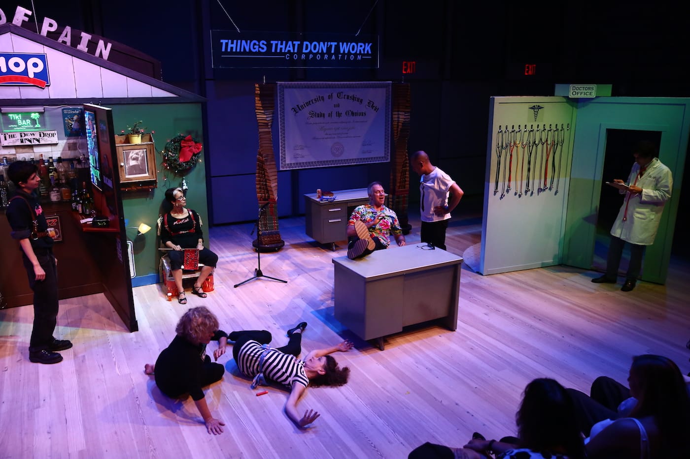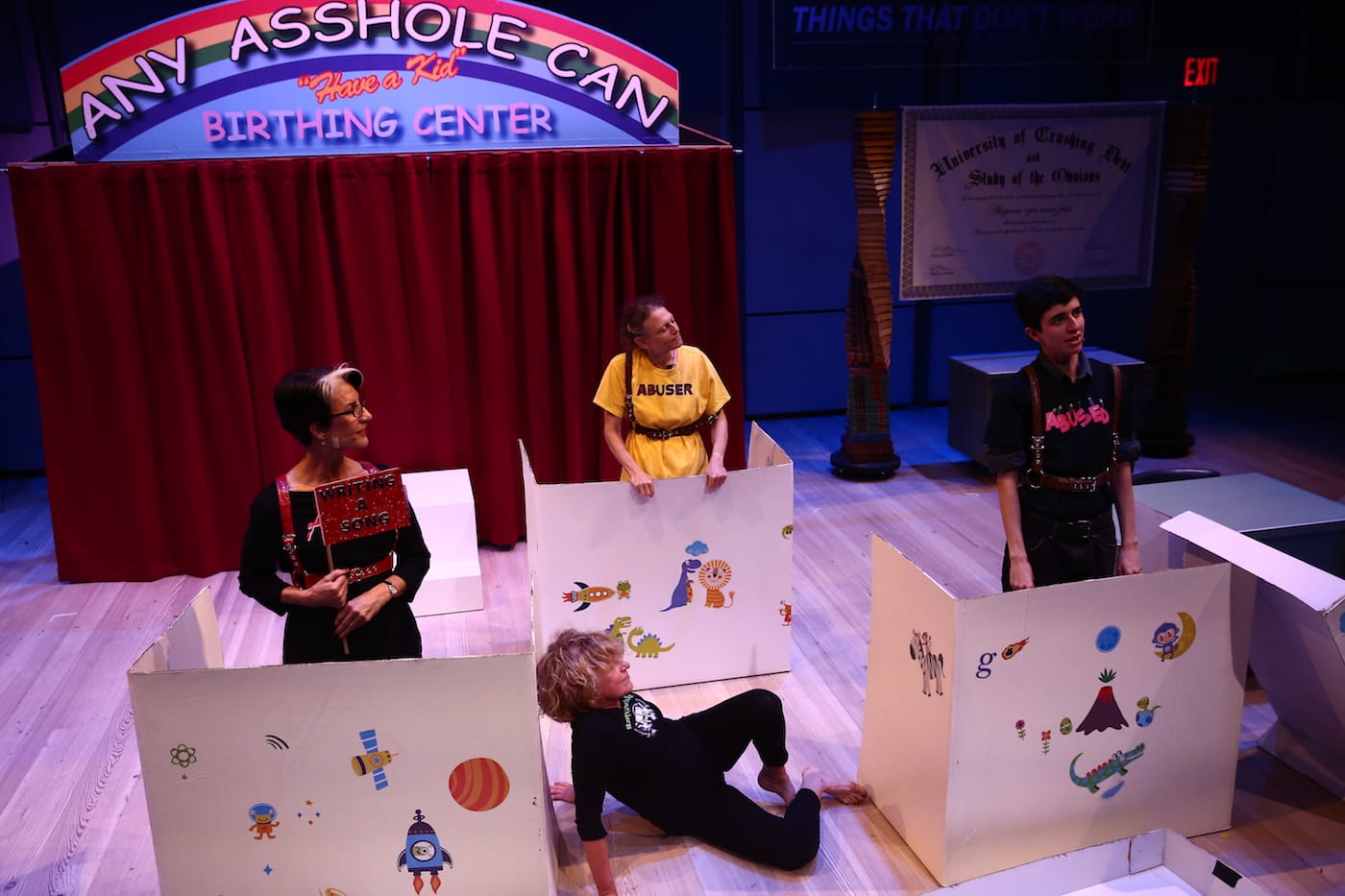 The audience sat on the long side of the brand new black box Susan and John Hess Family Theater, though the boisterous play seemed to yearn for a rougher space, flimsier sets, and the consecrating smell of a joint burning in the darkness. Program notes describe the play’s style as “casually untheatrical,” which is to say, the opposite of method acting or realism, consistently unemotional, and studiously unstudied. In a series of monologues that punctuated the latter part of the play, the non-actors read from pieces of paper plainly marked “Life Script,” so the audience could see. The “Life Scripts” were omniscient psychological narratives of hopeless persons blindly repeating damaging behaviors in relationships with the wrong people, to whom they are attracted for terrible reasons, often having to do with damage done to them as children by their clueless, also damaged parents. When shown in a relationship, the characters delighted in collecting flags marked “Injustice,” because they could then persecute their partners with more evidence of victimhood. The performers’ artlessness showed how we fail to see these basic problems and self-destructive tendencies, no matter how obvious or plainly stated.