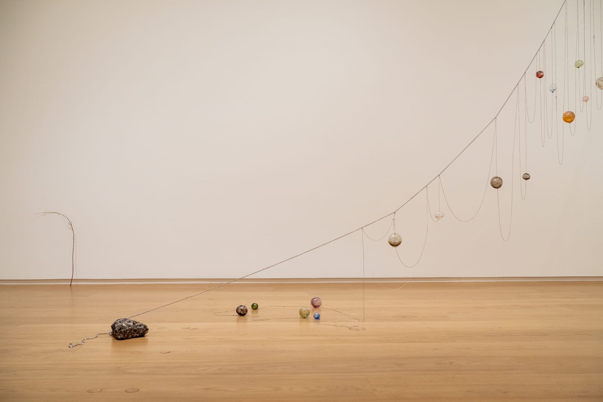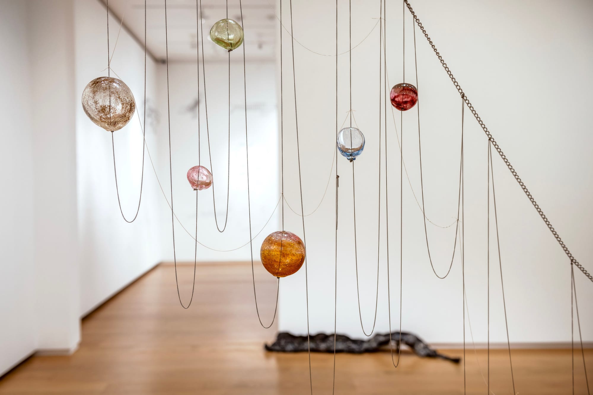 “Cetus” (all works 2025) partially levitates in the gallery, its colored glass orbs strung along thin metal necklace chains, sections of which are tethered to a chunk of asphalt on the ground, while others reach, drape, and collapse in squiggles on the floor. The sculpture traces the celestial constellation of the same name, citing Greek mythology and early forms of drawing and mapping. Centered in the gallery, “Cetus” serves as an orientation device, offering navigational clues for and readings of Conrad’s other works. The chain, with its numerous thin yet sturdy interlocking loops, is mirrored and magnified in the relaxed grid of “Letter.” This piece is formed by a string net suspended from the ceiling and embedded with pieces of hand-formed, illegible pewter letters that spell “I would gladly spend the night writing to you” in English on one side and French on the other. The net, with its slouching, figurative form and airy nature, can be read as embodying the poetics of both language and space, and a collapsing of interior and exterior.