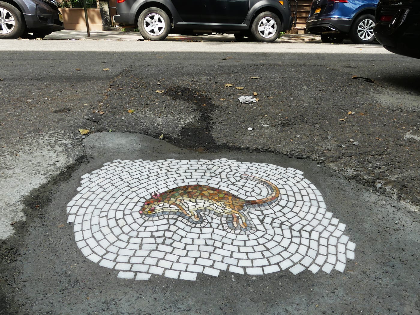 But Chicago is not New York. Our streets are danker. Our potholes are bigger. And our Department of Transportation is crueler. (Shout out to the MTA!) Appropriately, then, Bachor decided to debut a new series of mosaics for this concrete bunghole where dreams are made up called “Vermin of New York.” The compilation includes dead rats, cockroaches, and pigeons — oh! — and President Donald Trump’s face.