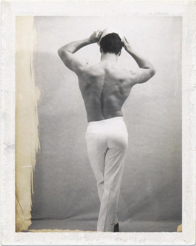 These corresponding front-and-back poses powerfully suggest a sort of collective unconscious in regard to images of men. I can’t help but wonder if French requested these traditional bodybuilder-esque gestures in order to apply them to homoerotic territory, or if the model assumed them without having to be instructed. They aren’t unlike stances you might see in a commercial physique shoot. Masculinity wins here. It mans up, doesn’t shut up.