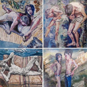 Scenery plays a critical role in most of the paintings. In one work, two lovers embrace and twist around each other on an abandoned street. Trash is scattered about and a dog stands guard. It’s not exactly the most conducive environment but they are far too enamored with each other to care about their grungy surroundings. In another work, two half-clothed adolescents stand before a mountain vista. Their poses are simultaneously trepidatious, curious, nervous, and excited. The saccharine scenery betrays that teenage urge to fulfill Disney-inflicted fantasies of a picturesque first love experience. Perhaps, the anti-picturesque sentiment of the more adult couple in the dirty street is a natural reaction to this younger aesthetic. In any case, both works employ scenery to reveal and reinforce the texture of the lovers’ emotional connection.