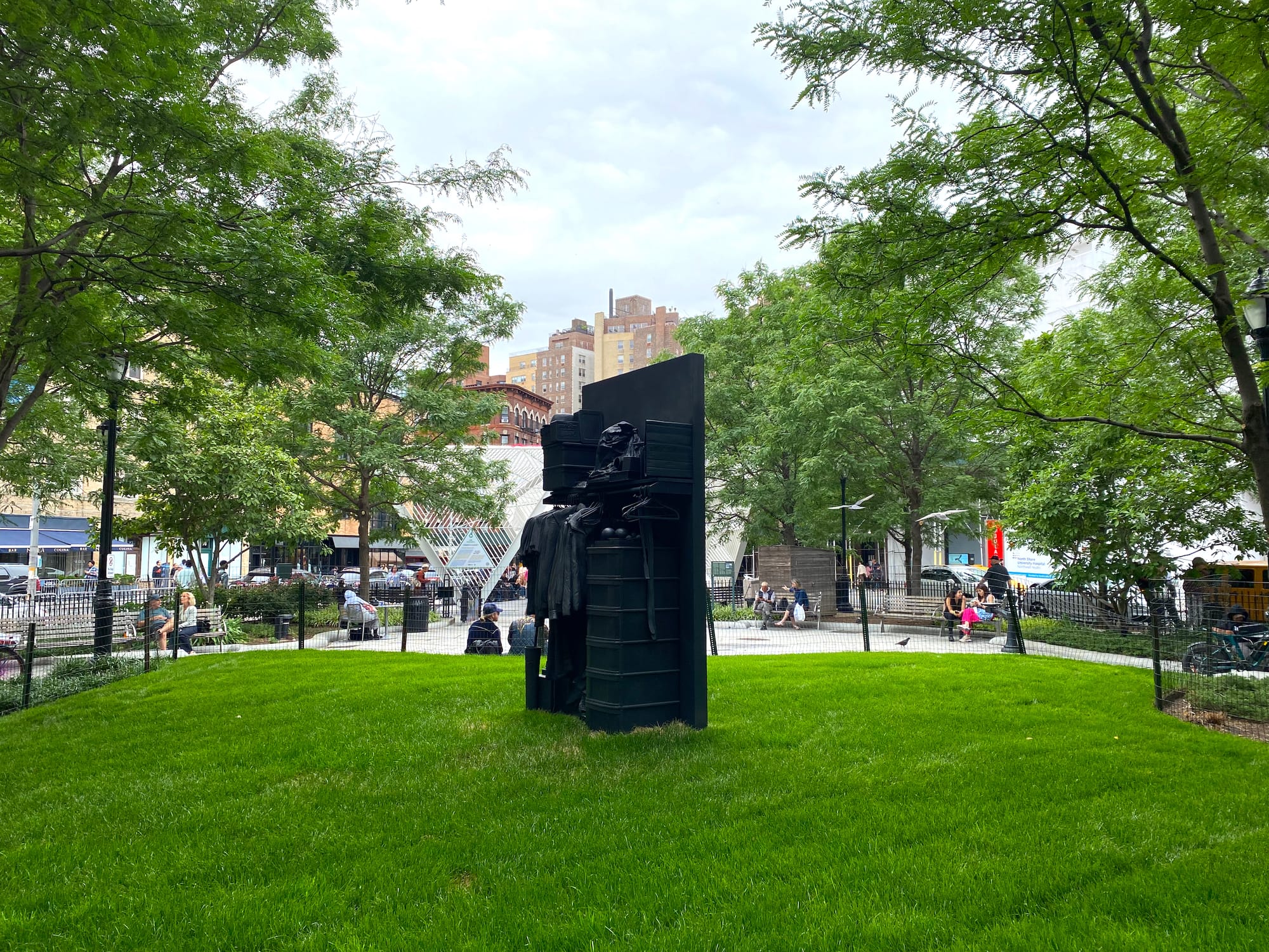 A granite and painted bronze replica of a bedroom closet frozen in time, "Craig’s closet" is an intimate interior space brought outdoors that explores the intangible experiences and memories contained in material objects left behind: shirts and jackets on hangers; filled drawers and packed shelves; stacks of untouched books and folders; bags and boxes holding unknown treasures. Its solemn black color is a distinct contrast against the striking white of the park's triangular monument and the facade of the Greenwich Village Lenox Hospital that peaks through the green tree foliage in the background. From the front, Hodges's sculpture depicts a crowded closet coated in black full of minute details that each tell a story; from the back, these features are condensed into a monochromatic wall whose only details are the sunlight and shadows bouncing off its watery surface.