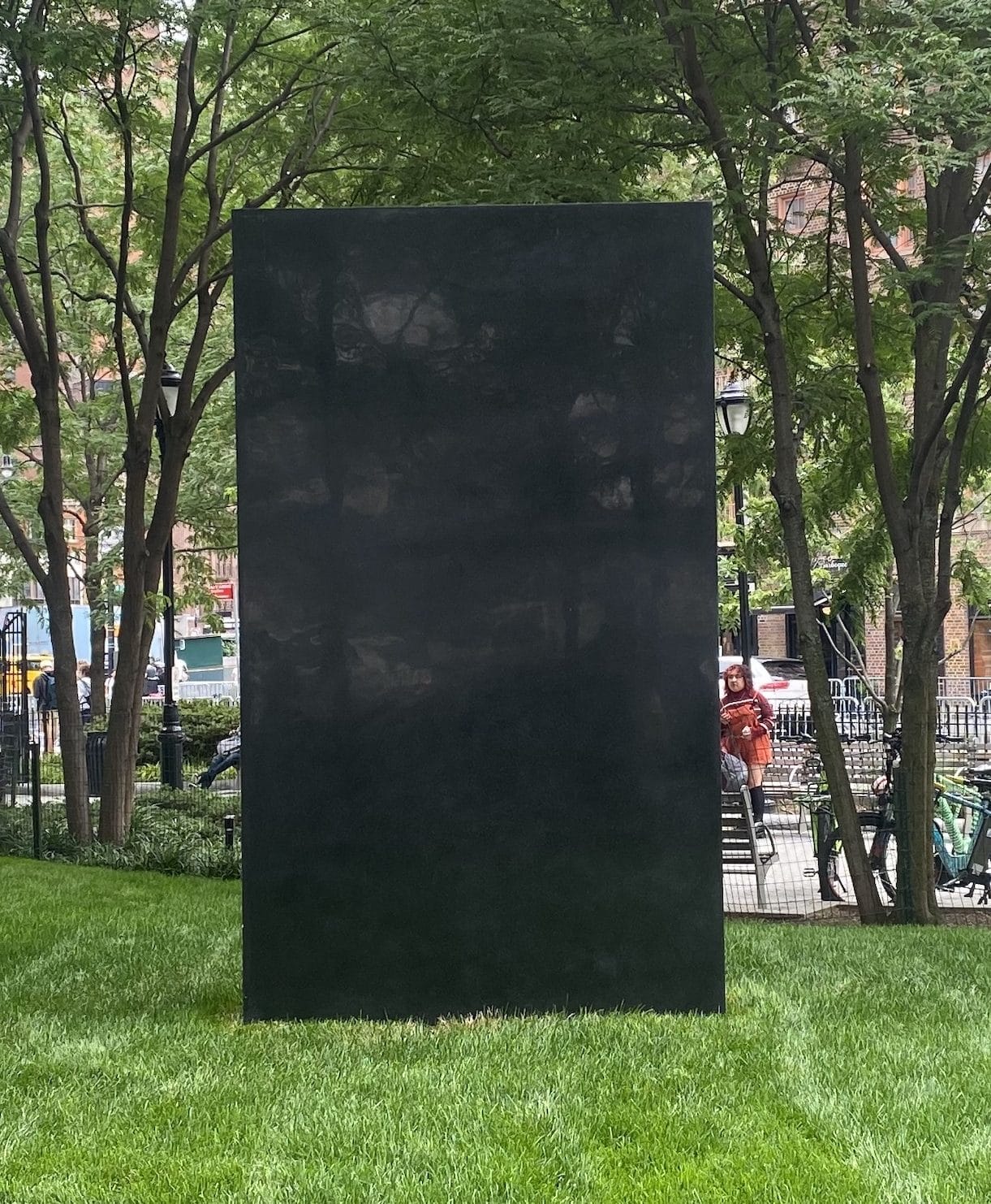 On a recent Thursday afternoon, hurried passersby and park visitors seemed unaware of the striking dark sculpture situated in the grassy clearing. Sitting on the benches lining the park's perimeter and splayed across the stone steps leading to the lawn, many appeared oblivious that afternoon to the park's new centerpiece as they continued to scroll through their smartphones or converse with friends in typical New York fashion. But Sumit Kaur, who stumbled upon the memorial while exploring downtown Manhattan, found herself immediately drawn to the dark closet when she entered the park from its northeast corner.