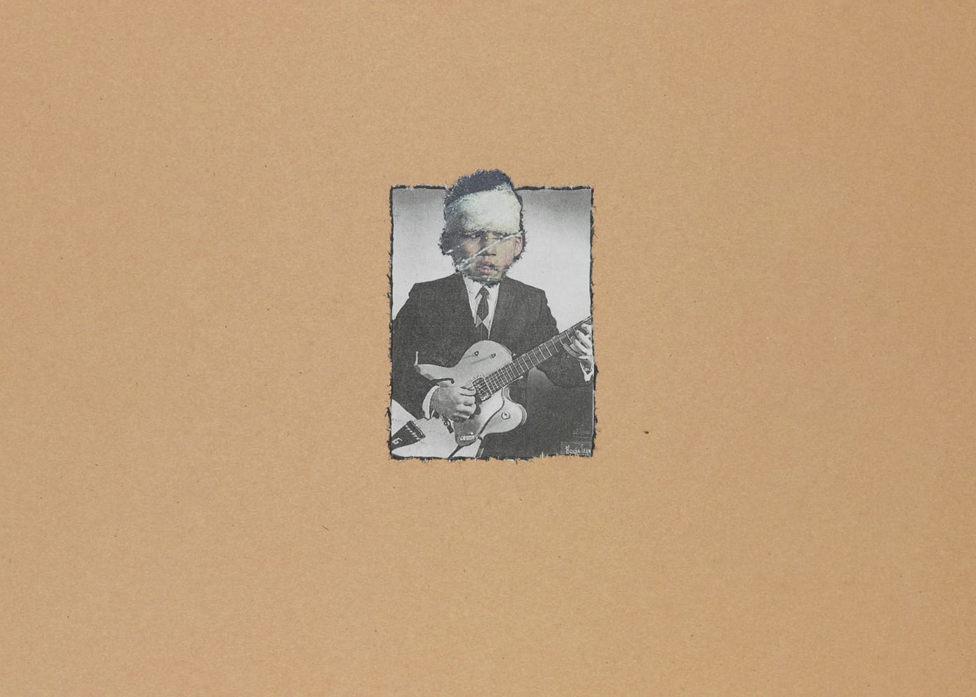 What can we divine from Some Collages about Jarmusch in the singular, comparing these aesthetics to those of his long film career, which includes Stranger than Paradise (1984), Down By Law (1986), Dead Man (1999), Broken Flowers (2005) and Only Lovers Left Alive (2013)? An eye firmly fixed on the minutia of the everyday, for one, and the power to twist a symbol with the smallest intervention. Jarmusch’s go-to alteration is removing the original face or head and its replacement with another visage, often identifiable from pop culture or art history, sometimes animal. So too, there are moments where the head-space is filled by a little gasp of newsprint — specifically chosen or from the page beneath, it is unclear — but throughout the works presented, the juxtapositions are inescapably Jarmuschian. The word “Auschwitz” is framed in the empty face of a Pope surrounded by adoring nuns; a cheetah-headed woman leans reflectively against a railing; Warhols, Warhols everywhere.