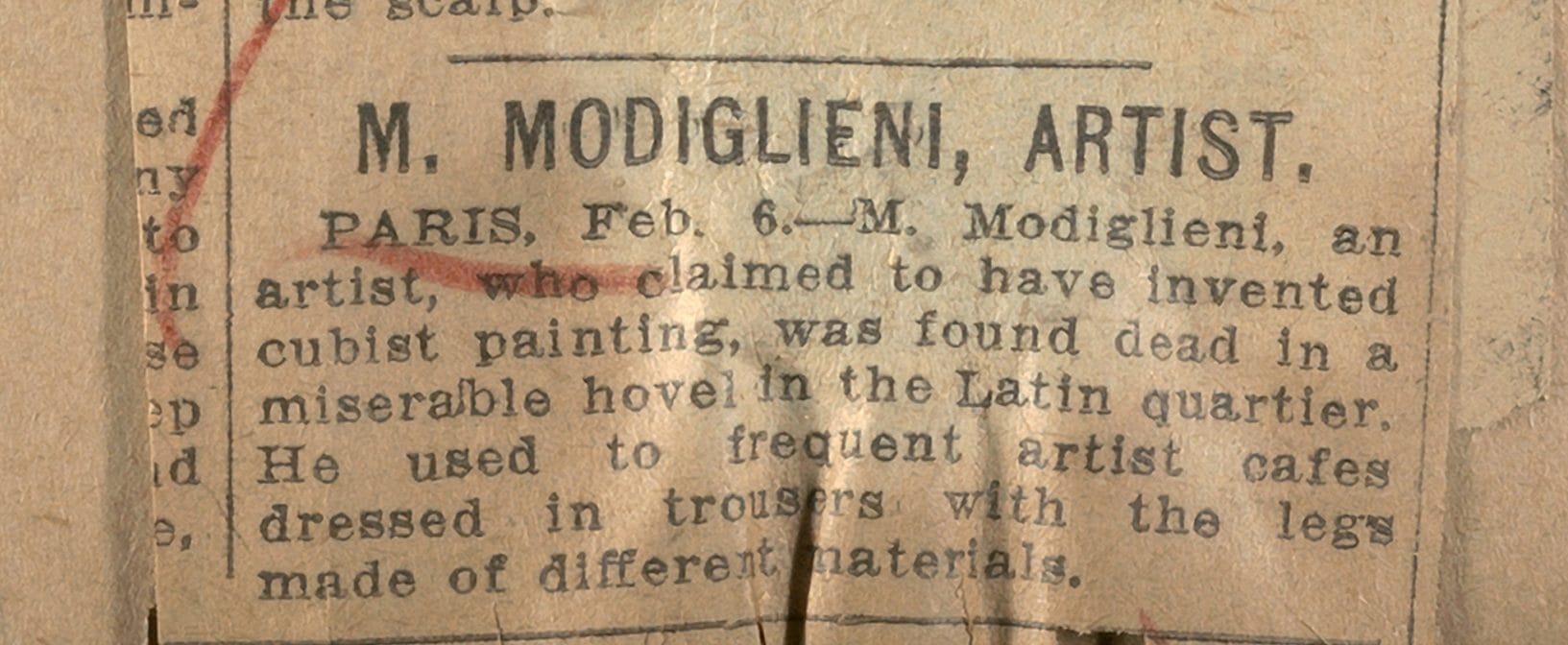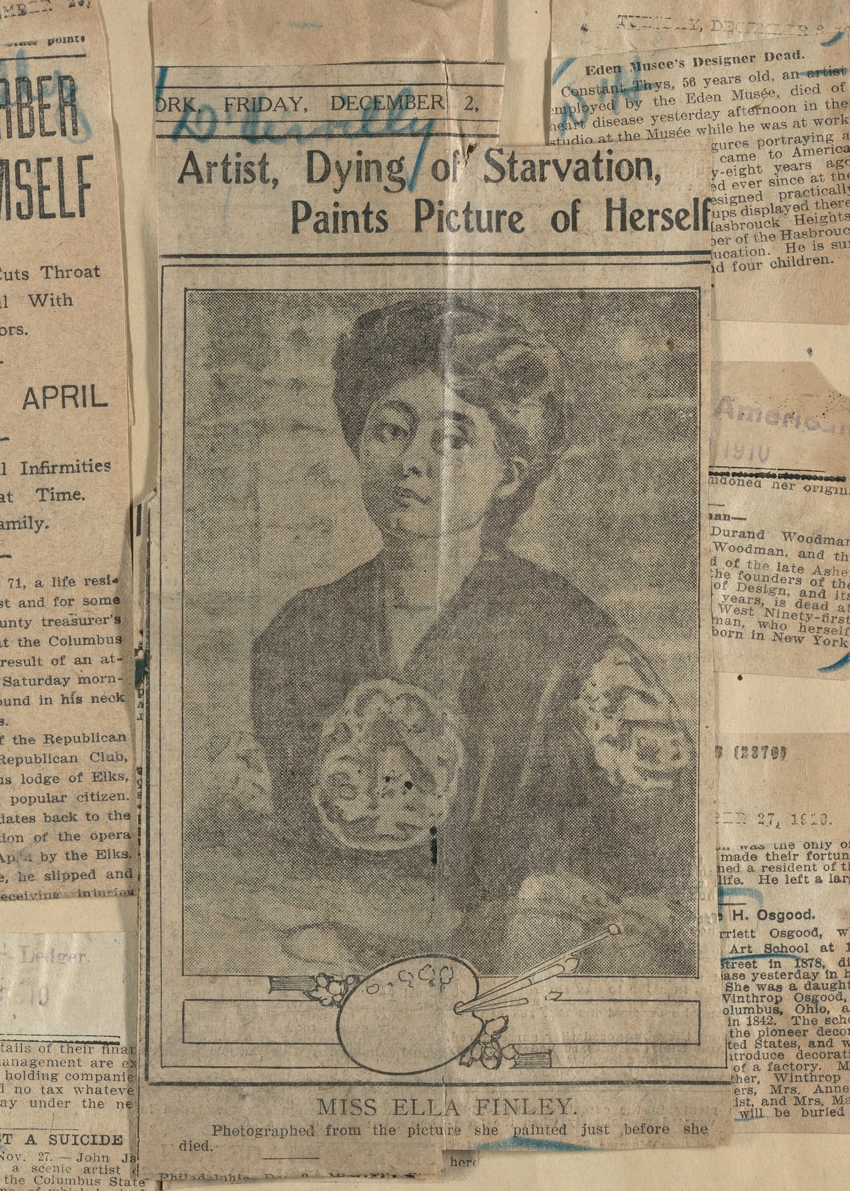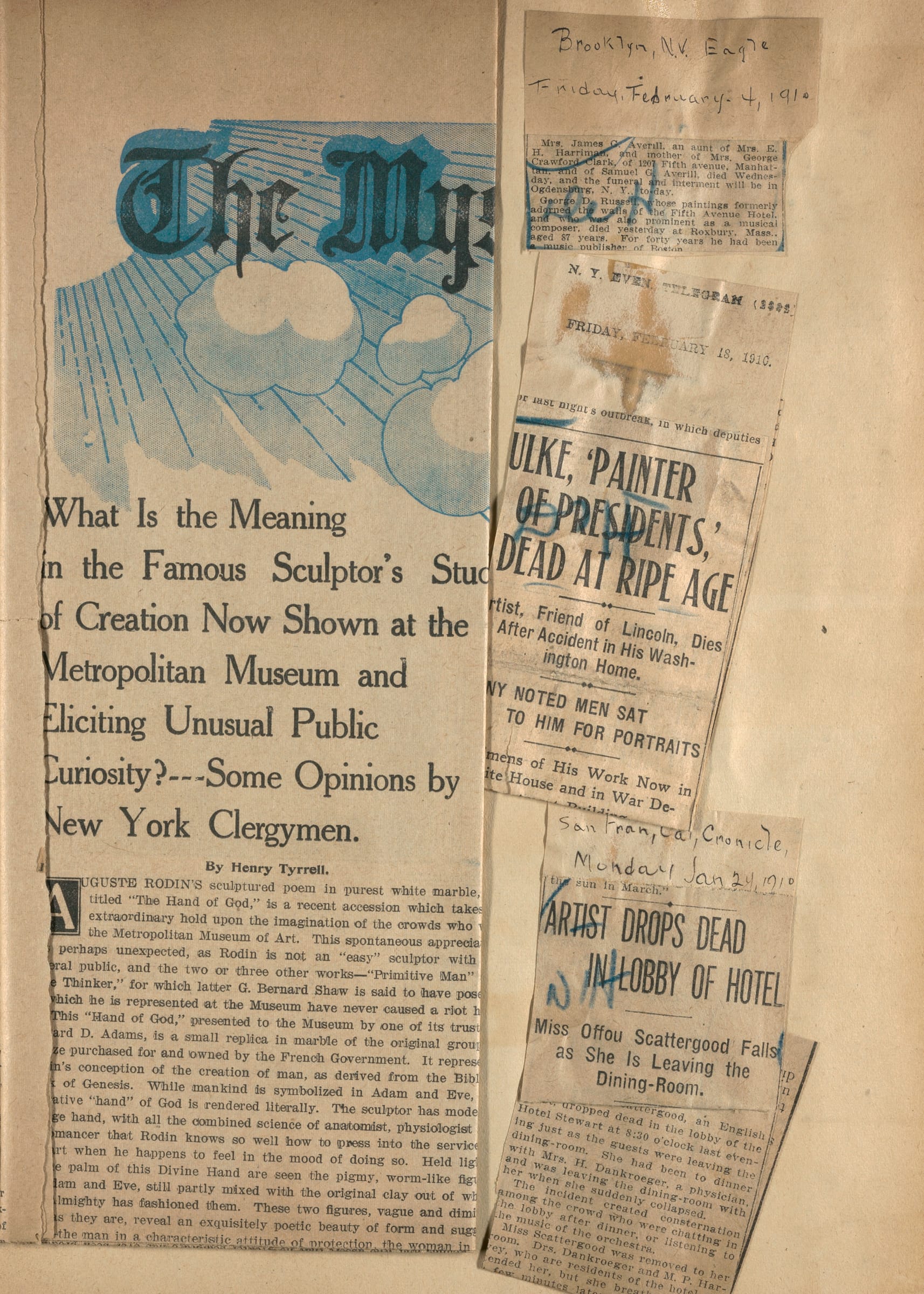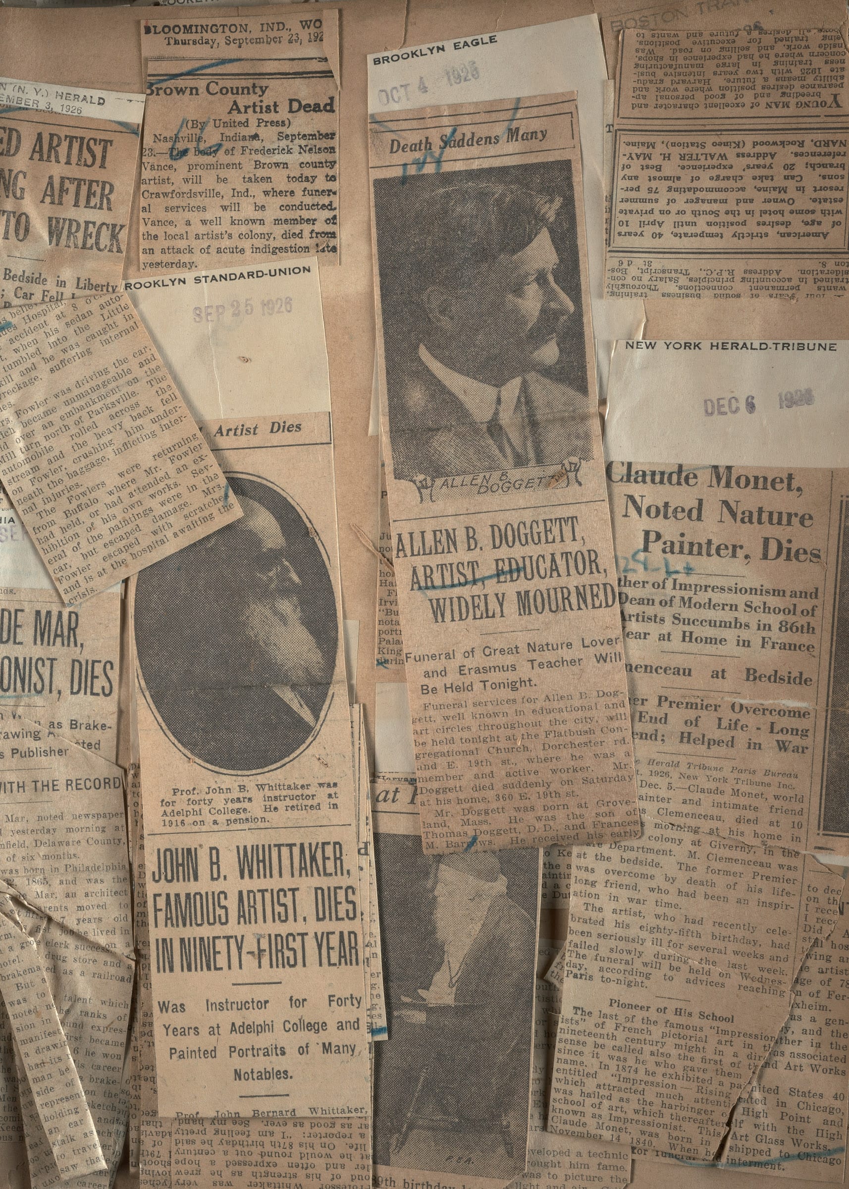 “What first sparked my interest in these obituaries is the grim poetry of their headlines, which I learned is typical of the brash editorial style of the early 20th century,” Moske told Hyperallergic. “For example — 'TWO ARTISTS END LIFE WITH BULLET.' Then, as I dug into the scrapbooks more deeply, I became fascinated by a contrast between obituaries for well-known artists of the day, which tend to be respectful and focus on life accomplishments, and those for obscure characters, which often emphasize strange aspects of their deaths.”