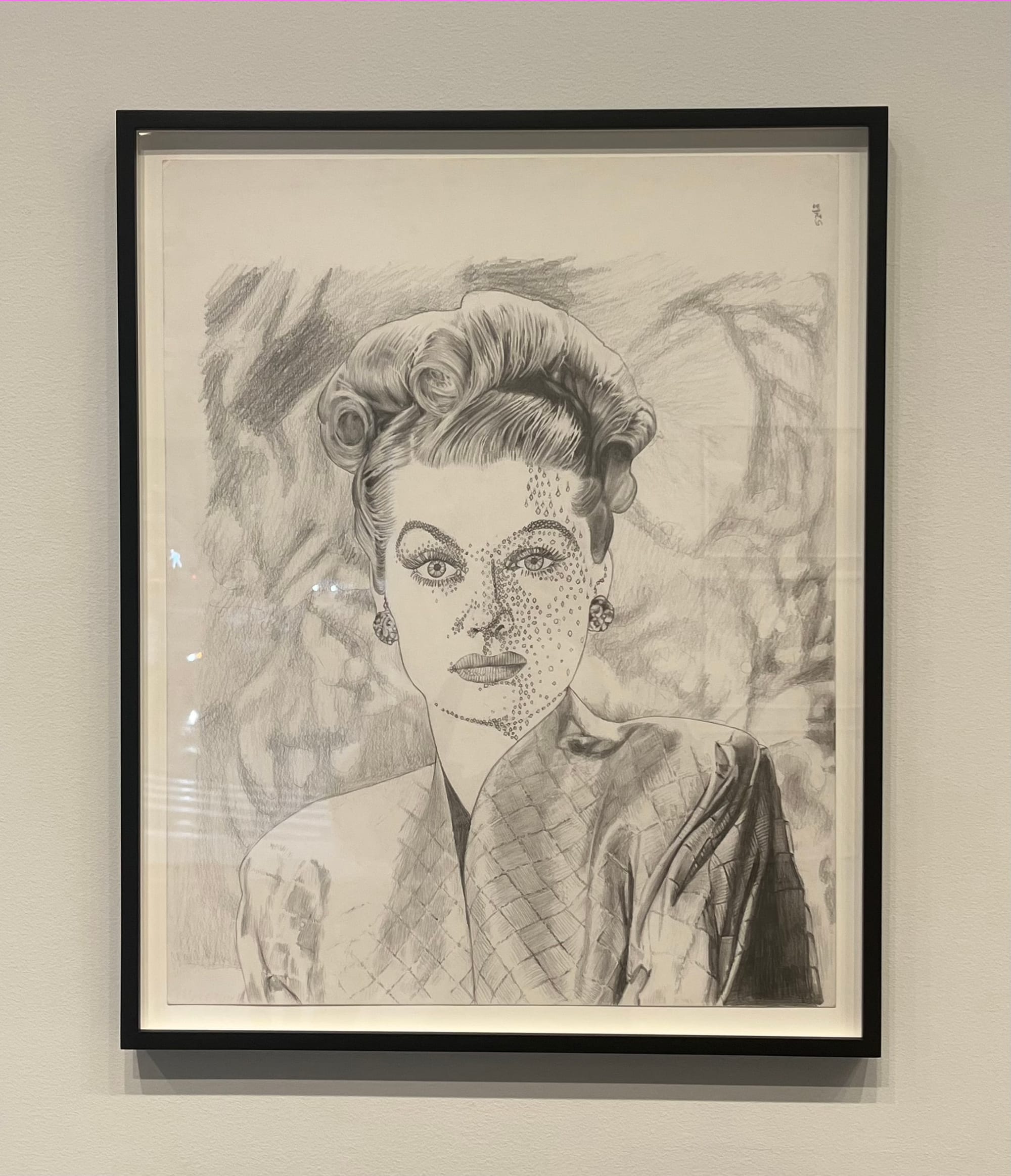 In “Study for ‘Dance, Girl, Dance (Lucille Ball)’” (2020), he presents viewers with an arresting portrait of an icon of American comedy. While the drawing alludes to the almost mesmeric appeal of Hollywood glamour in our culture, Shaw adds a dreamlike quality by overlaying a pattern of spots on the actress’s face. At the same time, Lucy’s piercing gaze and unsmiling expression — an unexpected portrayal of the I Love Lucy star — points to a darker, bewitched side of canonical pop culture.