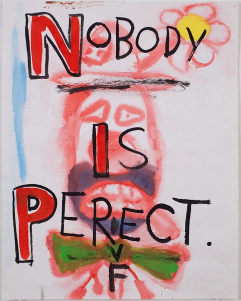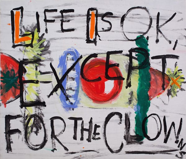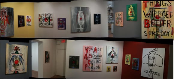 Since the show opened, I’ve visited it at least five times and each time I find myself dashing past his more conventional portraits to stand in the middle of the clown room filled with joy. Some of the paintings scream out with feel good phrases informed by the Oprah age, “You Are A Sensitive Caring Person” or “You Are Fine,” while others are more ominous, “I Don’t Want to Die.”