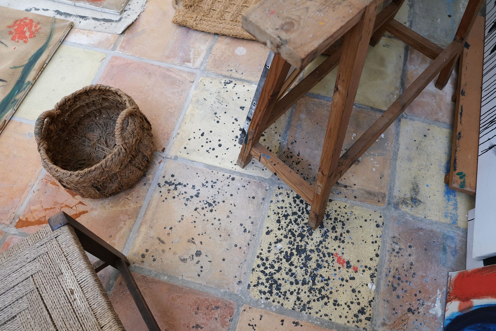 The question was whether the previous set up of the Taller Sert really reflected Miró’s working methods and space. The artist worked privately in the studio, and few people spent time there while he was alive. Studying rare documentary photographs and films that were made of Miró working in the 1970s and early 1980s, Juncosa and her team were able to map the locations of studio furniture, easels, and tools and more accurately position them. Each floor tile was photographed and studied for paint drips, splashes, handprints, and footprints that were then compared to marks on rugs, furniture, and other objects, as well as individual paintings, in order to learn about the placement and execution of Miró’s artworks. They recreated Miró’s original arrangements of postcards, ribbons, newspaper clippings, bones, sticks, stones, shells, Mallorcan siurell ceramic figurines, and other objects from his collections that were were essential to his creative process. Finally, the team spoke with Miró’s family members and others who had known him to better understand his working environment.