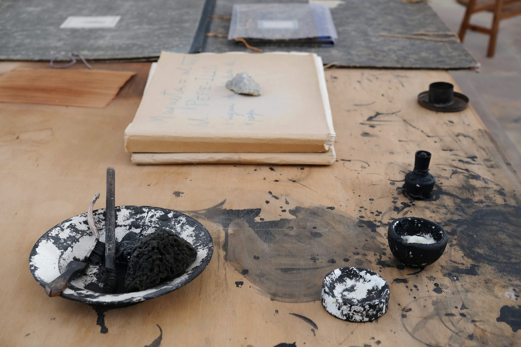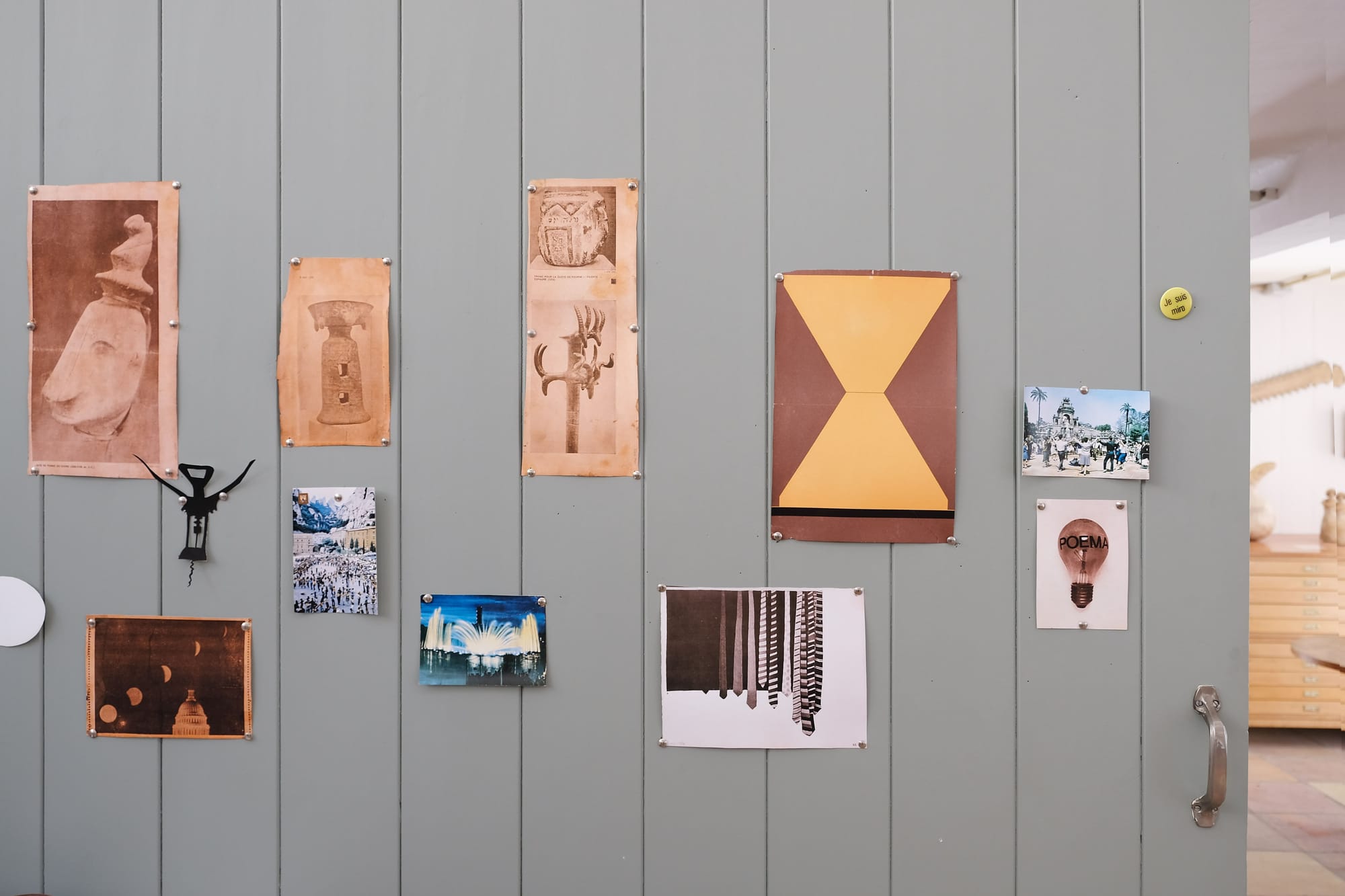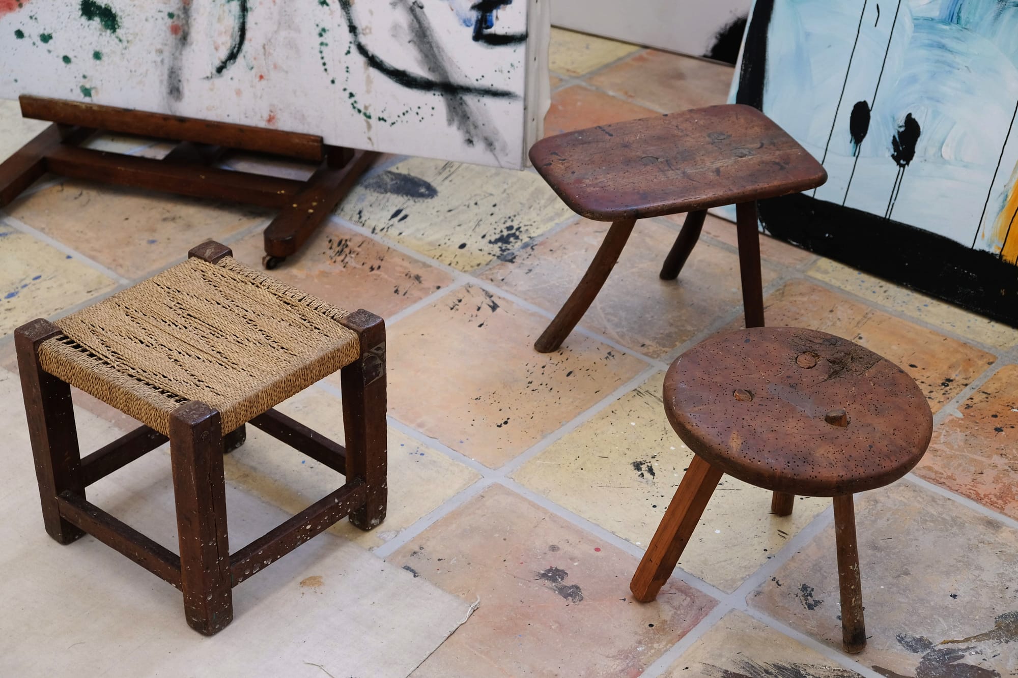 The question was whether the previous set up of the Taller Sert really reflected Miró’s working methods and space. The artist worked privately in the studio, and few people spent time there while he was alive. Studying rare documentary photographs and films that were made of Miró working in the 1970s and early 1980s, Juncosa and her team were able to map the locations of studio furniture, easels, and tools and more accurately position them. Each floor tile was photographed and studied for paint drips, splashes, handprints, and footprints that were then compared to marks on rugs, furniture, and other objects, as well as individual paintings, in order to learn about the placement and execution of Miró’s artworks. They recreated Miró’s original arrangements of postcards, ribbons, newspaper clippings, bones, sticks, stones, shells, Mallorcan siurell ceramic figurines, and other objects from his collections that were were essential to his creative process. Finally, the team spoke with Miró’s family members and others who had known him to better understand his working environment.