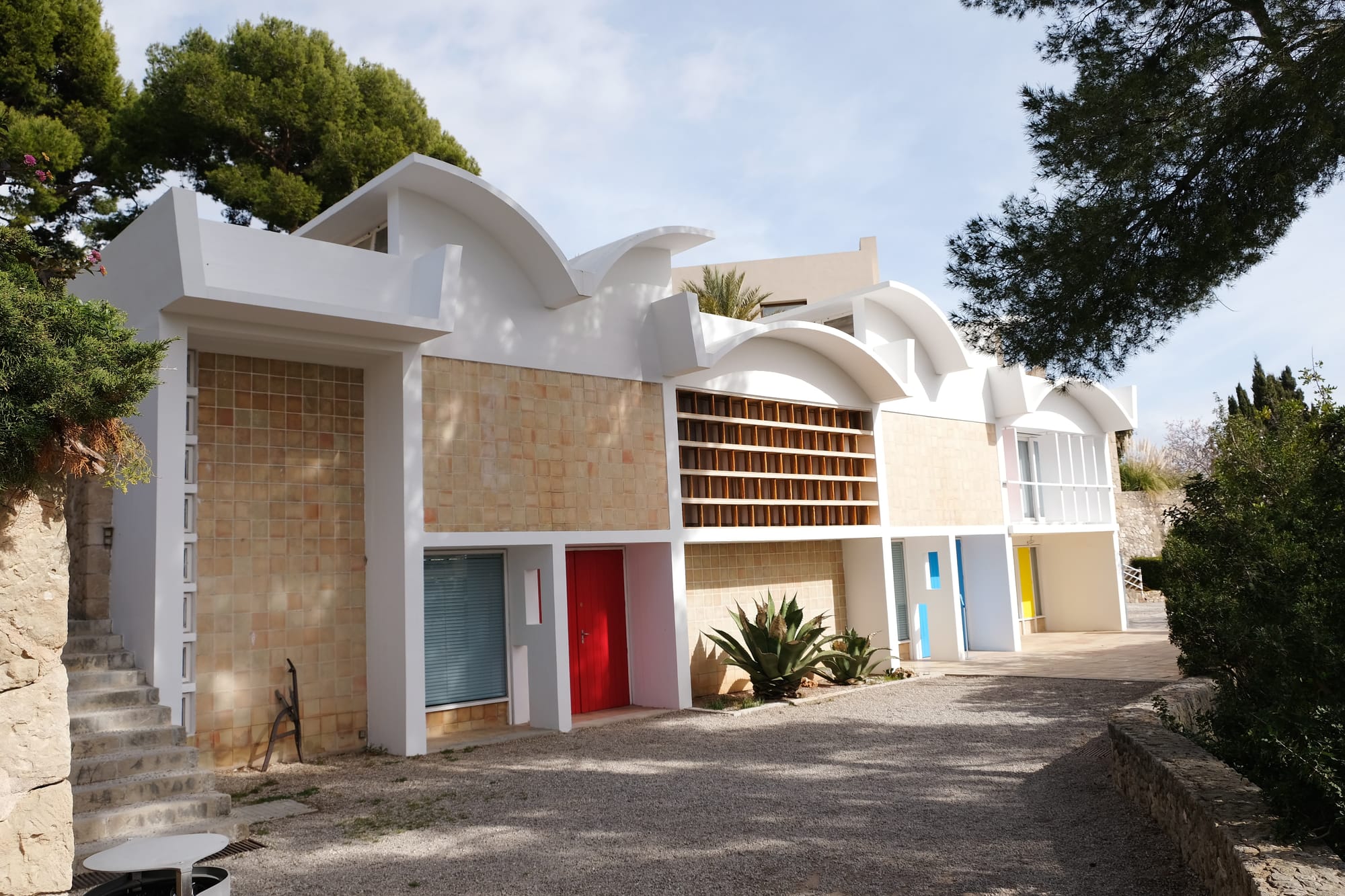 The Miró commission was Sert’s first project on Spanish soil since his exile. It allowed him to demonstrate his reverence for traditional Mediterranean building techniques and materials in their native context. His design incorporated brise soleils inspired by his work with Le Corbusier in Paris and concrete walls typical of modernist architecture, but wherever possible, Sert used natural, local materials like Mallorcan stone and clay tiles, while the studio’s shelving and furniture were made of local woods and palm fibers. In a 1954 letter Sert assured Miró, “I think you’ll like it … it’s the kind of building that will fit in with the landscape.” Throughout the building process, the artist and architect kept up a warm correspondence intertwining news about family members and friends with construction details and floor plans.