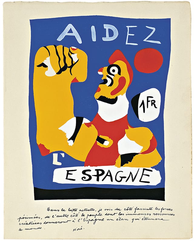 For a call for help, it packs a punch: an outsized yellow fist, raised in salute, all but leaps out of the blue background of Joan Miró’s color stencil “Aidez l’Espagne” (“Help Spain,” 1937). Open-mouthed, the stylized Catalan peasant who dominates the image is an emblem of strength and energy — a r