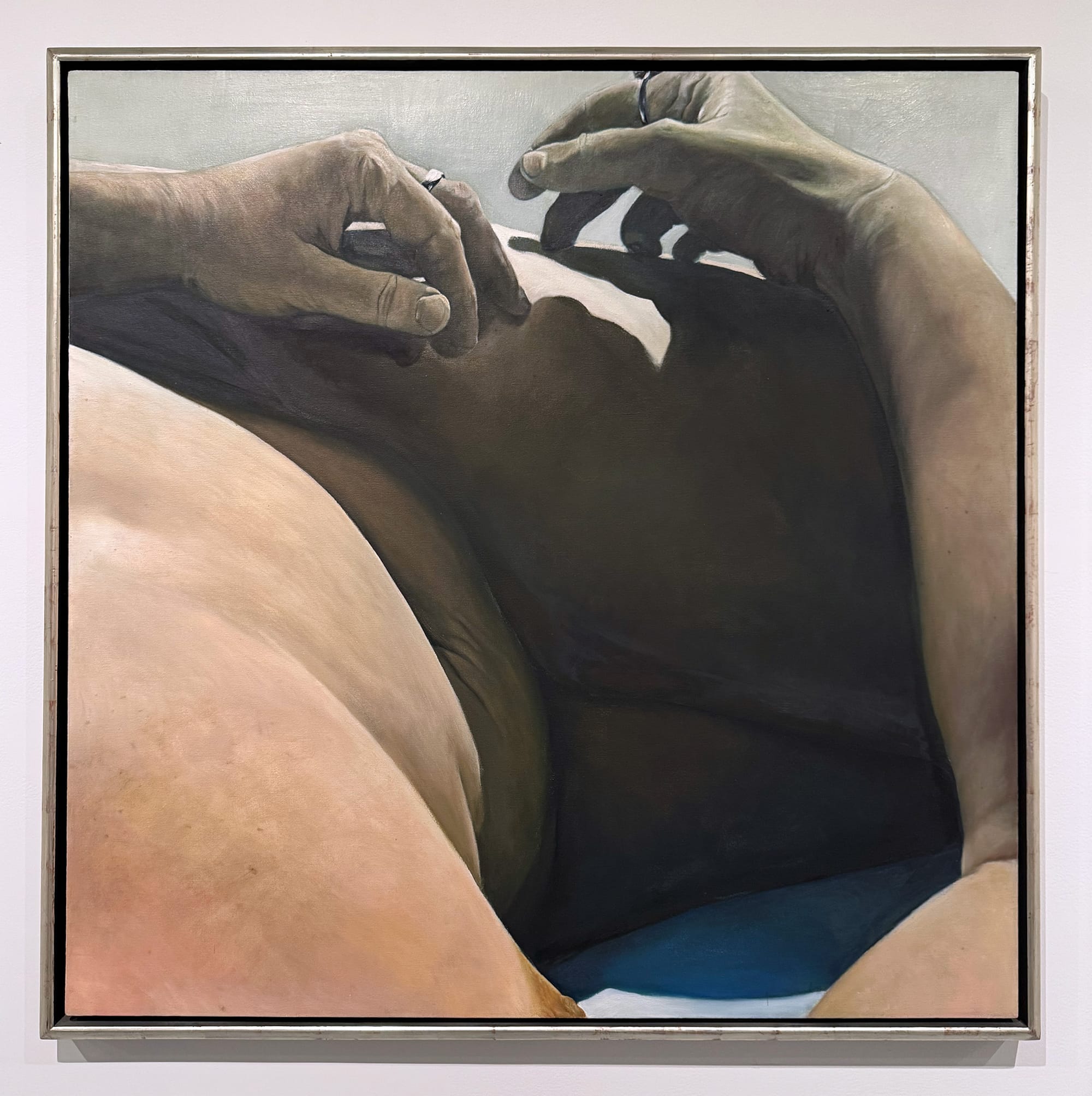 The 16 paintings in the one-room exhibition Joan Semmel: In the Flesh at the Jewish Museum constitute a sampling of various series from her half-century career, with a section in the center dedicated to works the artist selected from the museum’s collection. Toward the middle of the chronological review is “Horizon With Hands” (1976) — even its title is disquieting, suggesting a fusion of landscape and flesh. The bulk of the square painting is almost featureless; we could be looking at an expanse of stone or a rippling dune. It is the hands along the top edge that orient us: Follow an arm around the right side, and it clicks that we are the vantage point, looking down on our torso, a slab of torqued flesh — it takes a beat longer than is normal, or comfortable, to recognize a depiction of the body. Upon that realization, I felt a sense of dreamy, claustrophobic paralysis: Who am I, how did I find myself here? I wanted so badly to see a finger twitch, to feel in control of myself again within this alien form.
