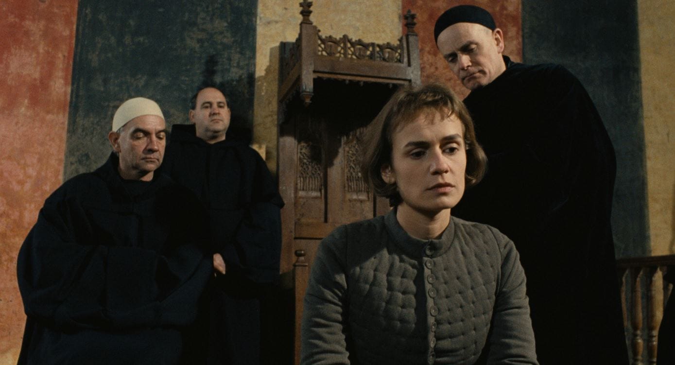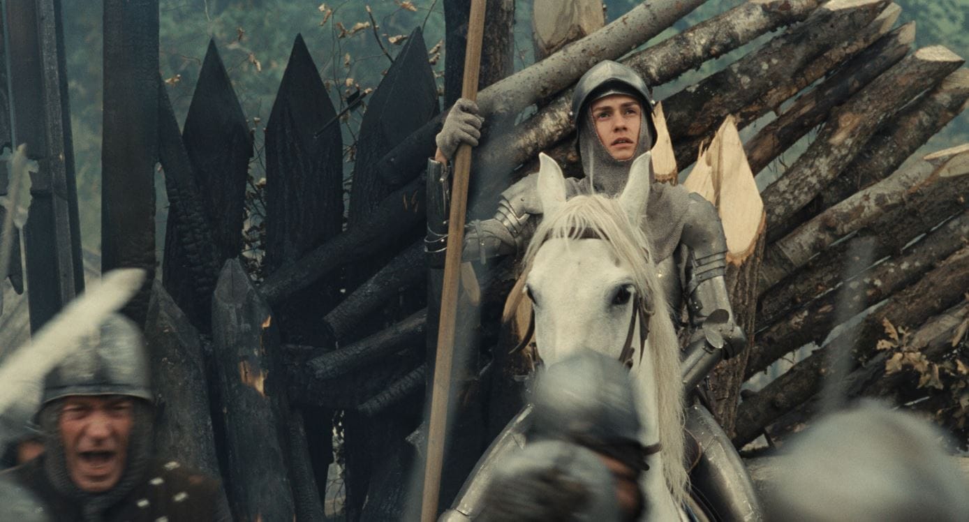 Running nearly six hours combined (The Battles is 160 minutes long, The Prisons is 176), Joan the Maid allows for a detailed historical retelling that begins in Part I, as Joan seeks escorts to take her to the deposed Dauphin’s castle in Chinon, and ends in Part II, with a howling Joan consumed by a pyre’s flames. Black intertitles are used liberally to cleave the action with dates and locations, lending the narrative the appearance of a precisely documented historical text. Although the film is clearly not a documentary, testimonies by peripheral characters describing unseen events create a sense of blinkered, collective memory, perhaps a nod to the imperfection of myth-making and history-writing. Rivette, known for his lengthy runtimes (consider his 12-hour-plus 1971 feature, Out 1), seeks out a sense of familiarity that’s grounded in time for his interpretation of Joan’s story — a contrast to many portrayals that maximize her other-worldliness and her spiritual and emotional fervor, as if to match the scope of her cultural significance.