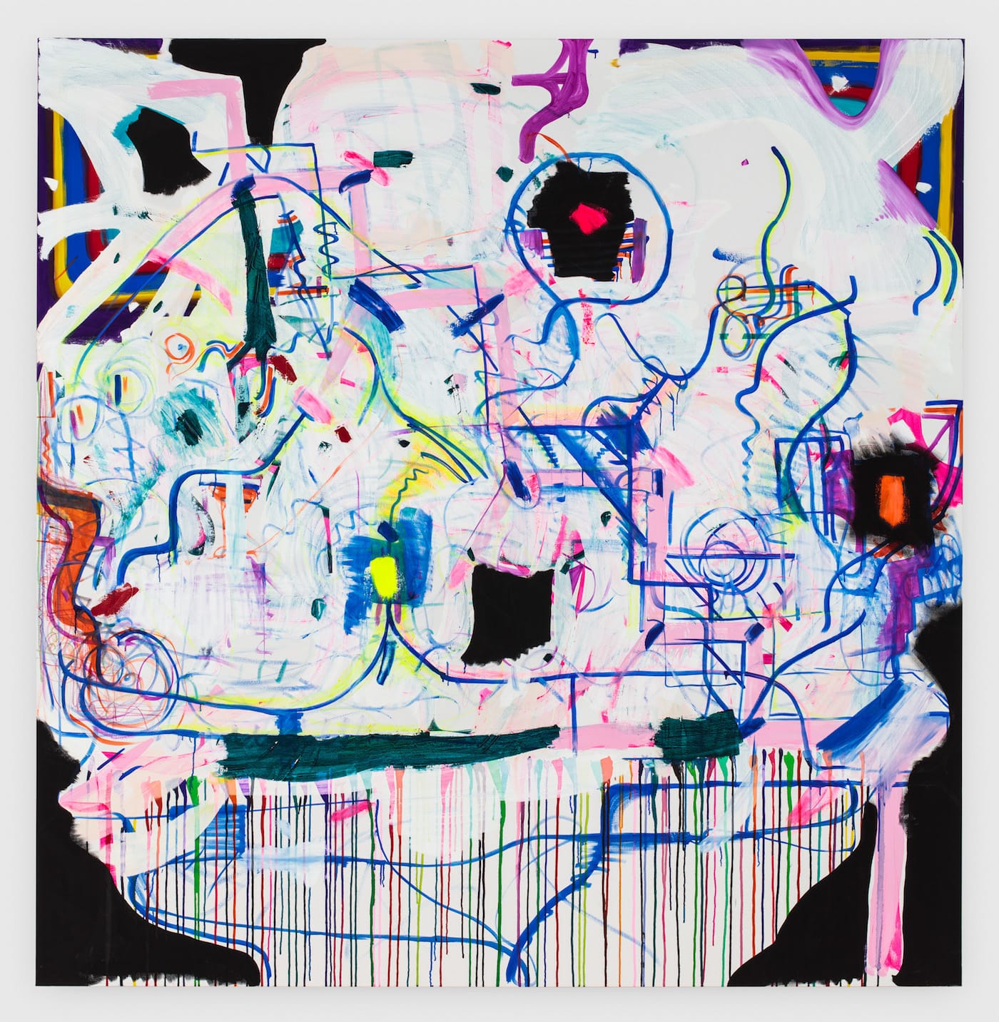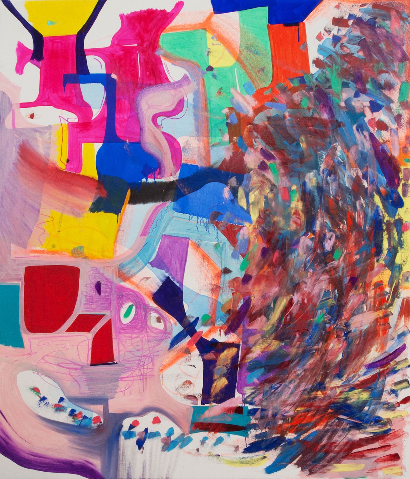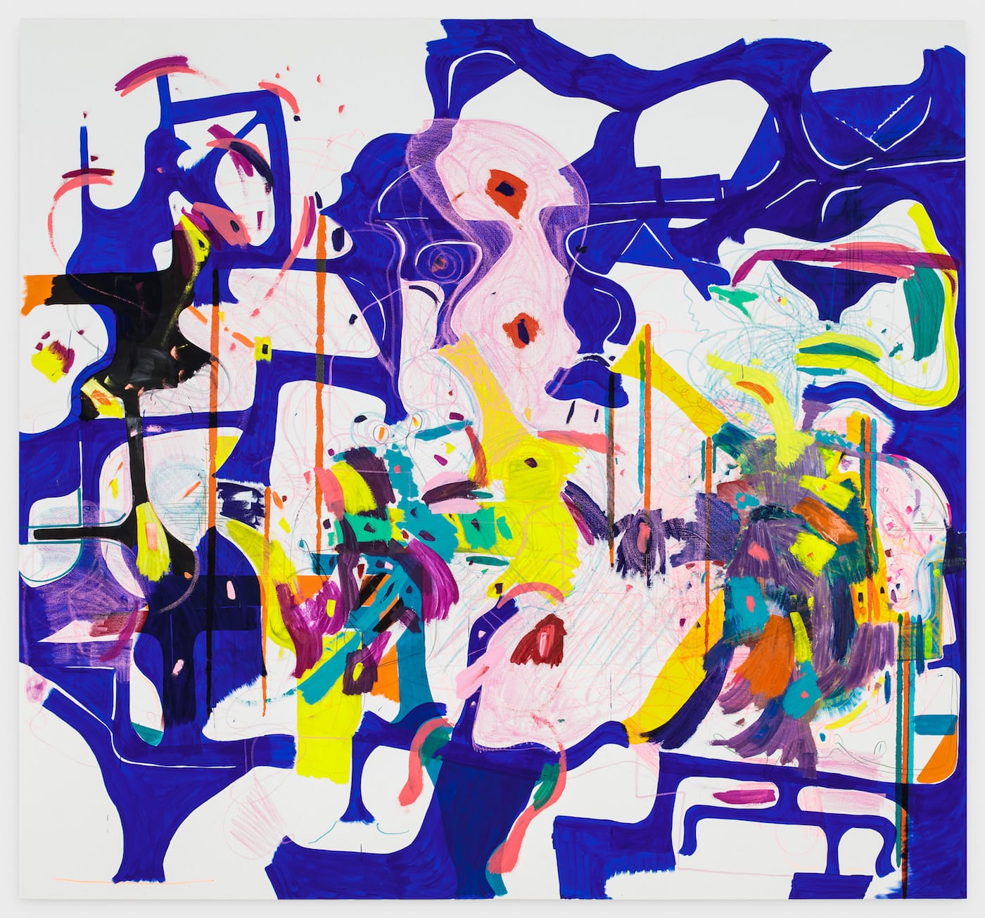 The white ground of “Untitled” is close enough to the gallery’s white wall that I wondered what it would be like if Greenbaum started making paintings on the wall. “Untitled” is like a party full of well-dressed adults, scruffy adolescents, lounge lizards and children in fluffy pink pajamas, all talking brilliantly at the same time. By spanning the hierarchy that distinguishes the sophisticated brushstroke from the child-like scribble, the artist dissolves the borders separating one kind of mark making from another. This is what I find so refreshing about her work. She is not trying to pass as an outsider or graffiti artist. Rather, she is bringing all these possibilities and mark making materials into play. She has opened up painting’s doors and invited everyone to come in.