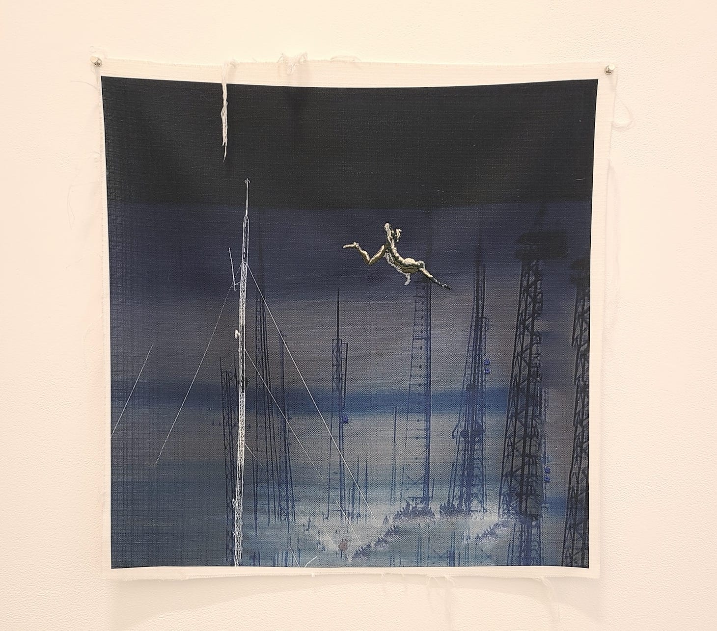 With his recent works on linen, Joe Lewis plies the idea of moving human bodies regarded as contraband via the surveillance network of the state.