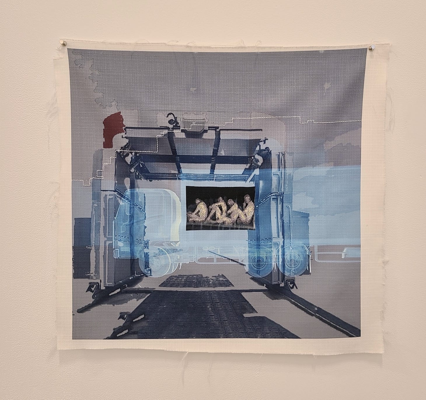 What spurred Lewis to make this work was a chance discovery made by reading press about US customs and border agents using x-rays to examine trucks and shipping vessels. The associated images of people packed in holds reminded him of images of Africans massed together in slave ships. All the works here consist of linen subjected to an industrial process used in large scale fabric manufacturing (dye sublimation) alluding to, as Lewis says, “undocumented workers and sweatshop labor.” (All titles are listed in English and Spanish.) Lewis plies the idea of moving human bodies regarded as contraband via the surveillance network of the state through several scenarios: the US war machine, human trafficking, unauthorized immigration, and escape.
