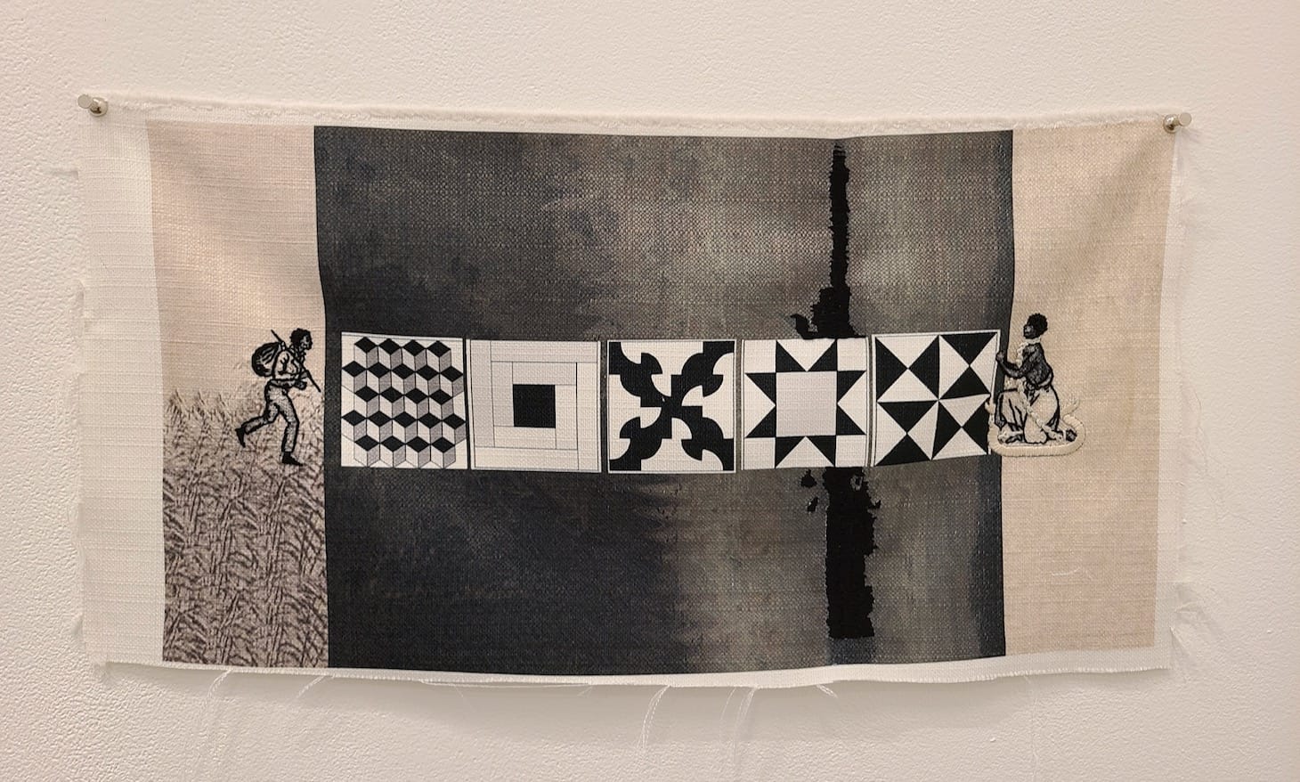 The images haunt me. One, “Catapult – Catapulta” (2019), depicts a human form hurtling through the air at a height that signals a disastrous landing. I ask myself what impels someone to take this kind of risk. Of course I already know. Then there is “Signs – Señales” (2019) where a passage composed of graphic symbols lies between a seemingly free Black man walking with a blanket stick and one who is shackled, suggesting that the pathway to freedom requires an ability to interpret such symbols. Those fleeing slavery needed to. Safe houses were a refuge only for those who knew the codes.