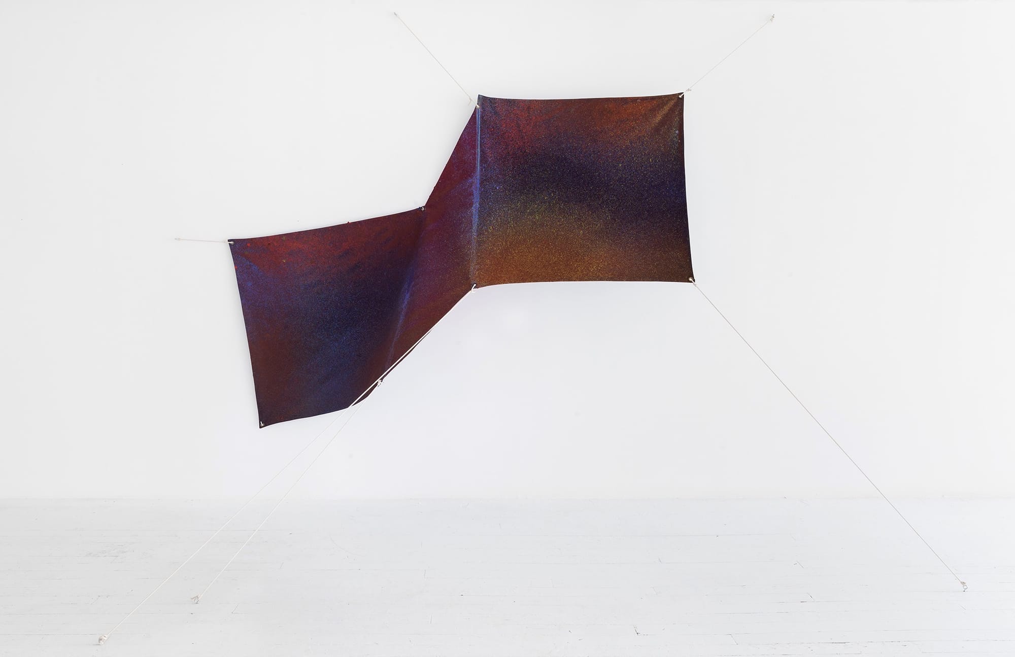 Those two modes are not always at odds, however. In ”Purple Flight” (1971, 136 by 117 by 47 inches, as installed), they are playfully, masterfully entangled. In this densely chromatic corner piece, suspended by ropes (as was by this time Overstreet’s wont), two square canvases hung at different levels are attached via a narrow trapezoidal swatch. The painted surface is sprayed or spattered, as if it had been caught in polychrome rain. From a distance of greater than a couple of paces, it’s not possible to discern whether the perspectival space, in which the trapezoid seems to bridge the apparent fore and aft positions of the squares, is illusionistic or actual; the view from the side reveals that the answer is “yes.”
