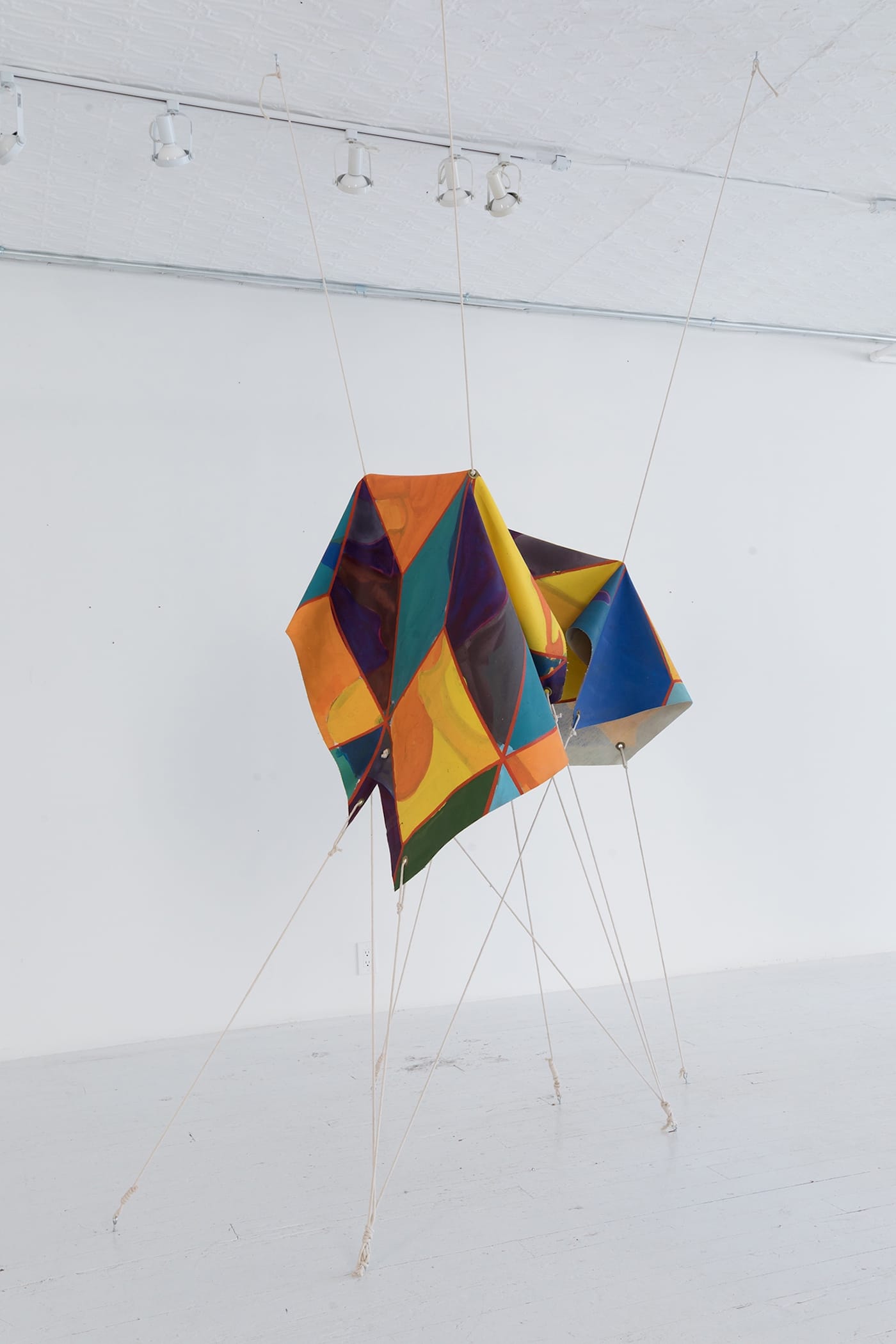Like many of the works in the show — though perhaps more than most — “For Happiness” invites the viewer to peek behind the exterior surface to glimpse the “back” of the canvas, where a tentative and evidently abandoned start still lurks. Tent-like, the enclosure suggests provisional shelter, painter as aesthetic nomad.
