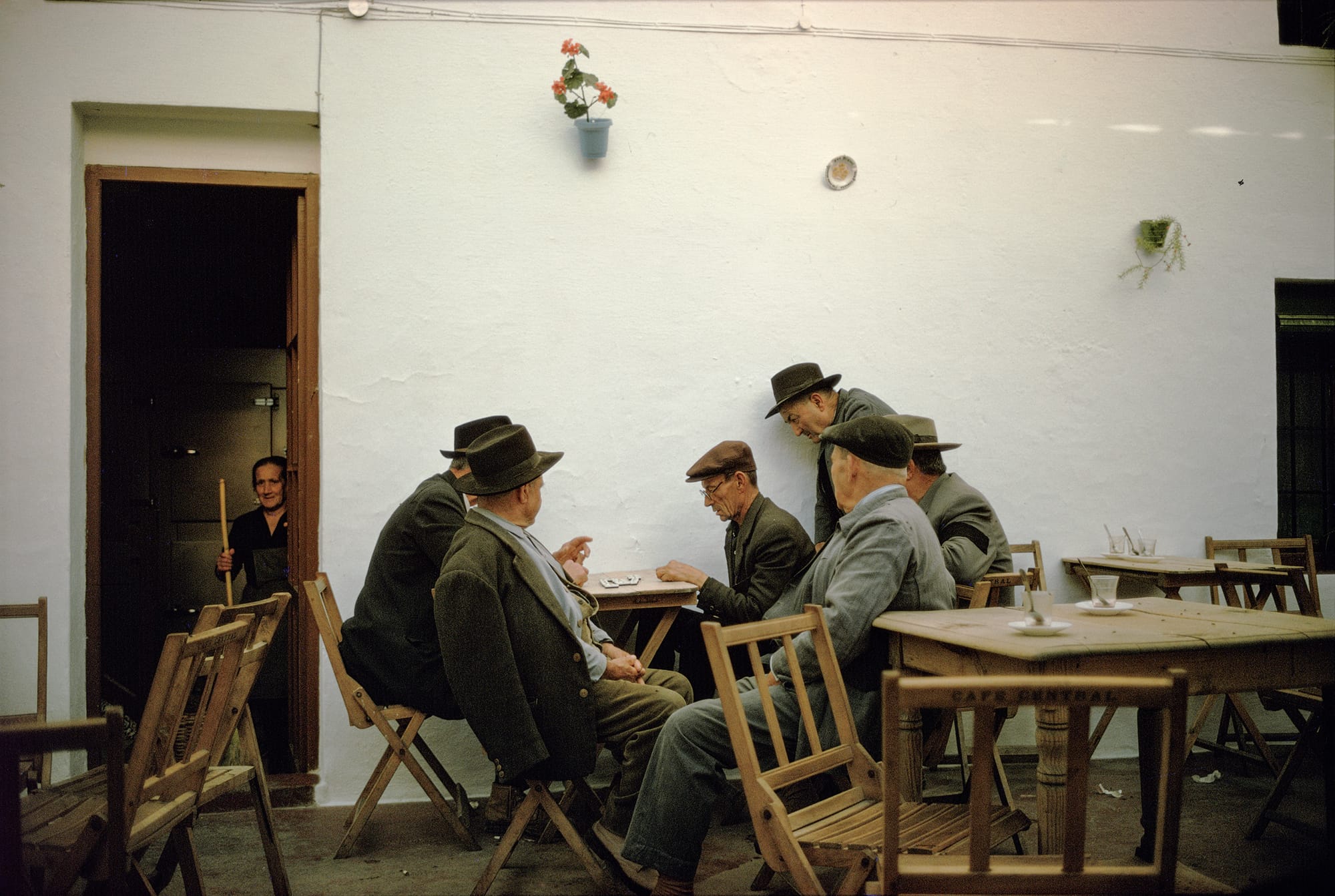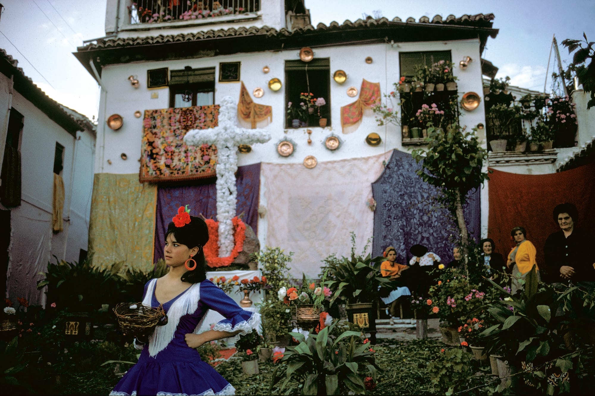 Meyerowitz’s unforced curation shines brightest in moments of humor and attentive observation. The significance of each bloom varies across photographs and rather than revere floral attractiveness or impermanence, readers are called to appreciate the myriad contexts. In “Cartema, Spain” (1967), a small pot with orange, geranium-like flowers hangs behind a group of older men playing dominos. A sole woman appears in a doorway holding a broom; much like the flowers, it’s unclear whether the men are aware of her, yet both plant and woman unmistakably alter the ambiance.