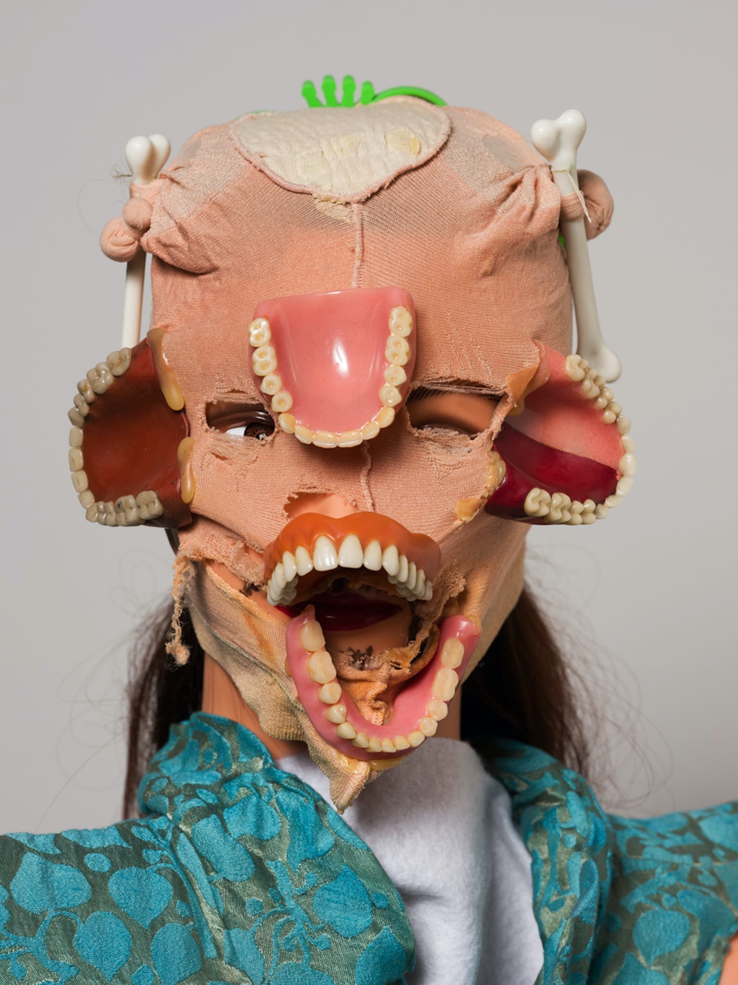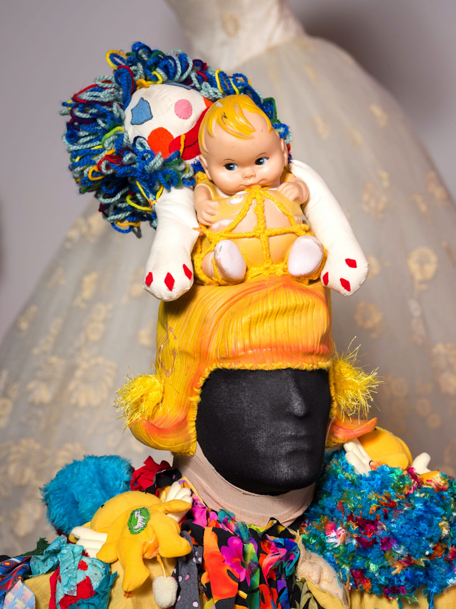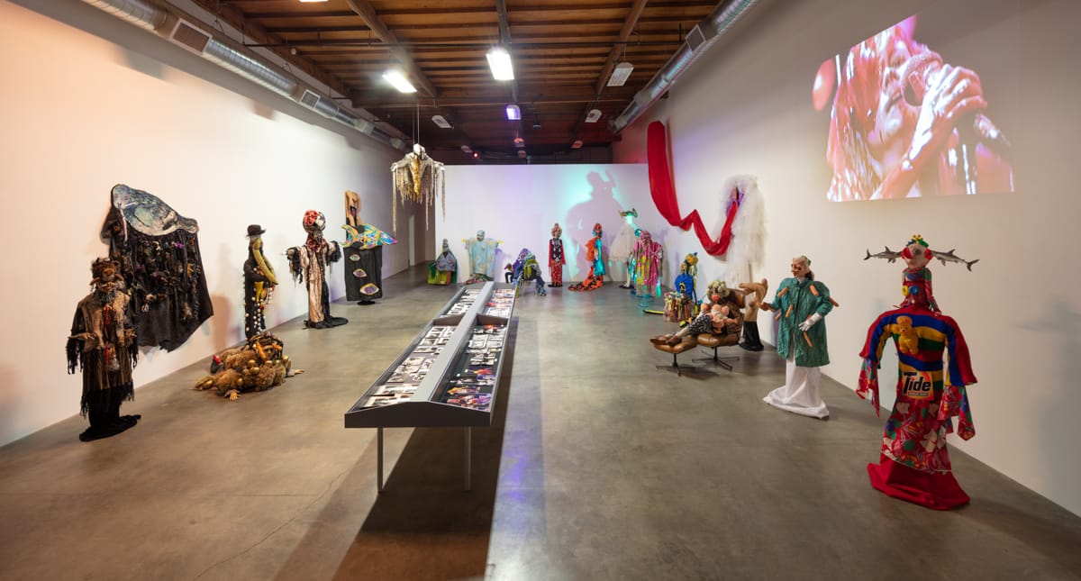 The costumes, which Went constructed mostly from discards found on streets and in dumpsters, combine craft with invention. Symbols of traditional women’s roles — baby dolls, high-heeled shoes, a nun’s habit — are integrated into colorful agglomerations of unruly femininity. In one eye-catching example, figures and symbols are painted on a metallic pink robe with a grotesque pink mask. Jarring juxtapositions of stuffed animals and dolls, skulls, and dildos exaggerate the creepy side of the visual extravaganza. Along with demented Muppet-like soft sculptures (including the aforementioned three-eyed head and a giant vagina spewing red fabric), they underscore Went’s ingenuity as a maker as well as a performer.
