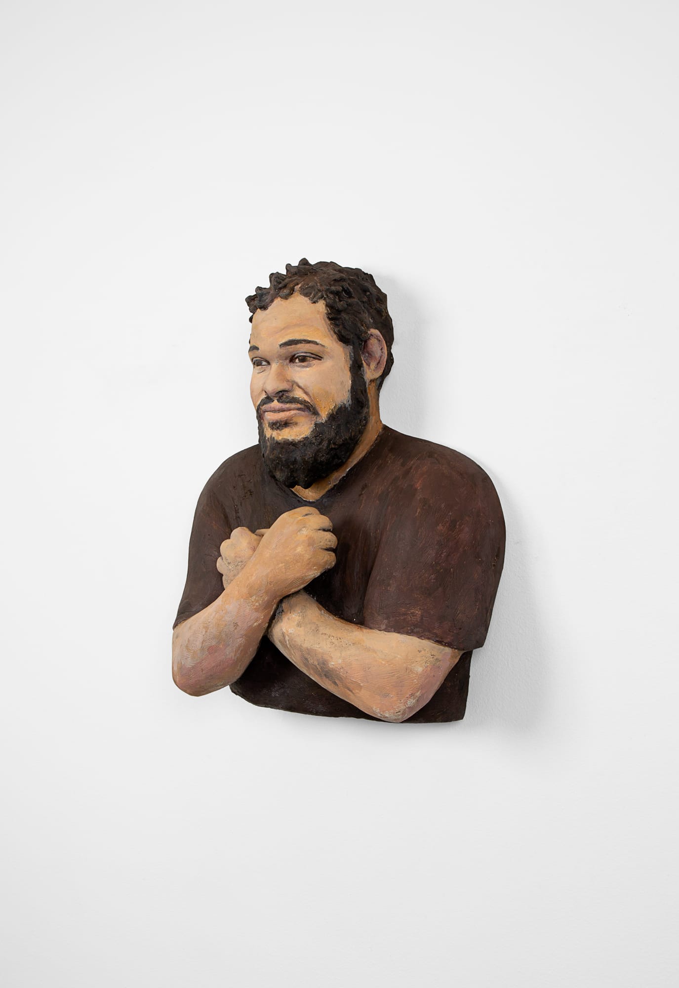 Over FaceTime, Charlie James introduced each sculpture like he would a friend. “This is Monxo,” he said, focusing on “Monxo BX” (2017), a plaster bust of a young Puerto Rican man wearing a thick beard and a cute smile, in a brown T-shirt, crossing his arms over his chest to make the Bronx BX. Each Ahearn bust is marked by an ambivalent countenance: one is leaning away from the viewer and rubbing his eye; another, a kid with an impenetrable expression in his graduation gown.