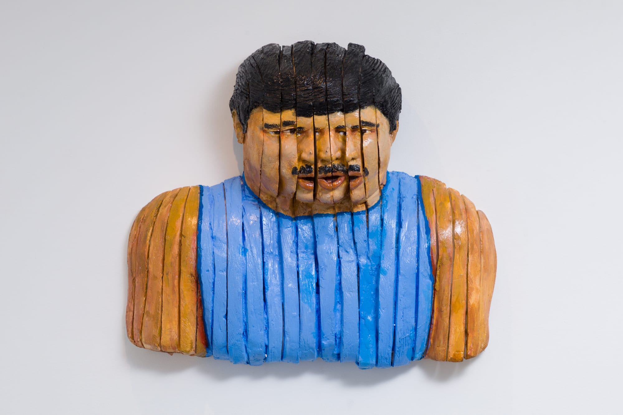 Torres’s “Split Portrait” (1997-2001), a bust of the artist’s face and shoulders cast in plaster and painted with thick acrylic paint, is sliced longways like ham. The undulation of each slice is like piano keys, each one a note playing all at once, discordant. A hand smashing down on the keyboard. Torres interpreted a near-fatal asthma attack like Umberto Boccioni’s “Unique Forms of Continuity in Space” (1913), his bright blue shirt and forehead swelling with Futurist dynamism, replicating the existential accordion wheeze of severe asthma.