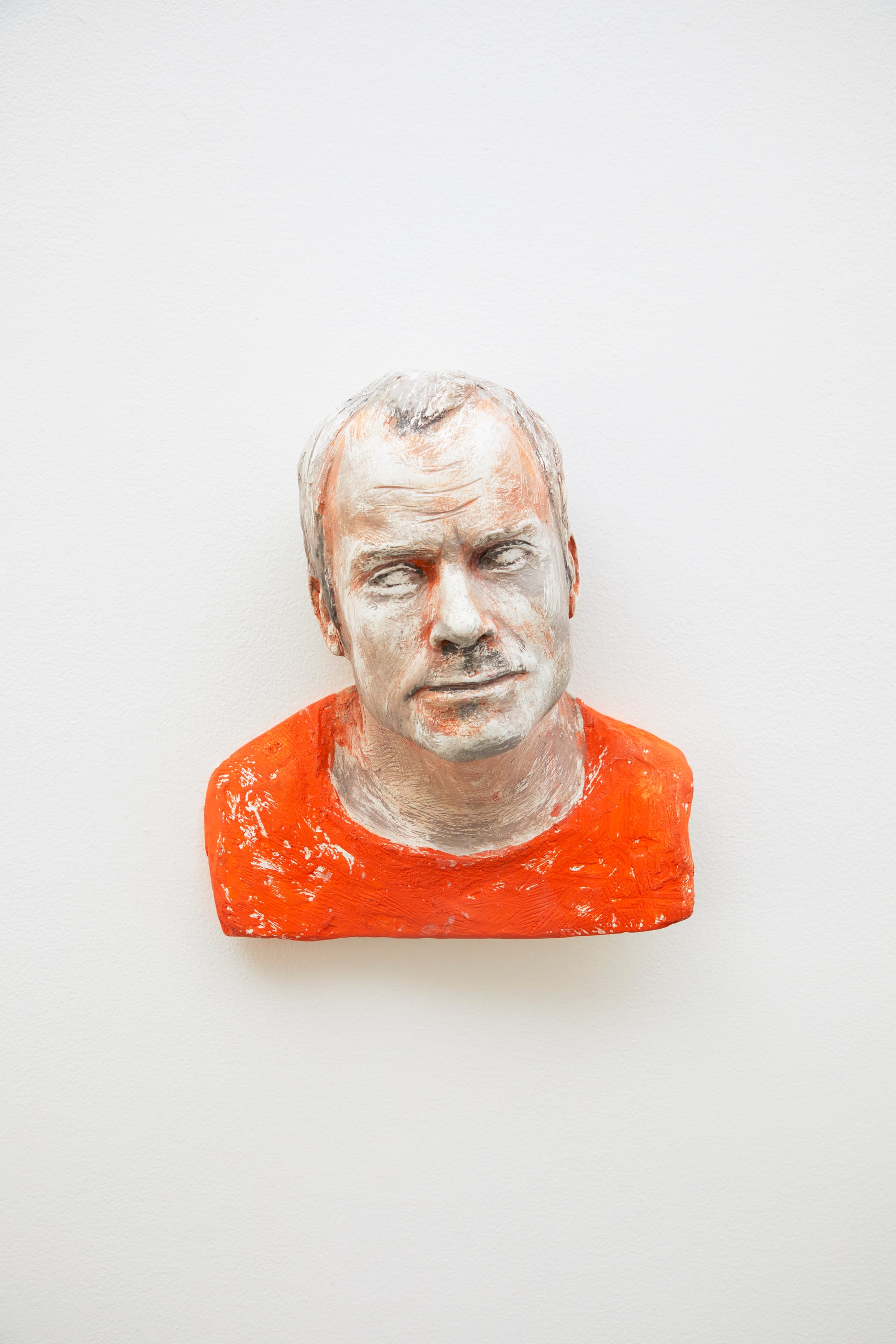 Take, for instance, the artists’ respective self-portraits. Ahearn’s “Orange Self” (2010) is a chalky plaster white with brushes of safety orange paint. The jaw of Ahearn’s face comes forward. No irises. Hellenistic horror in a T-shirt. He said he couldn’t get the pupils right so he left them blank.