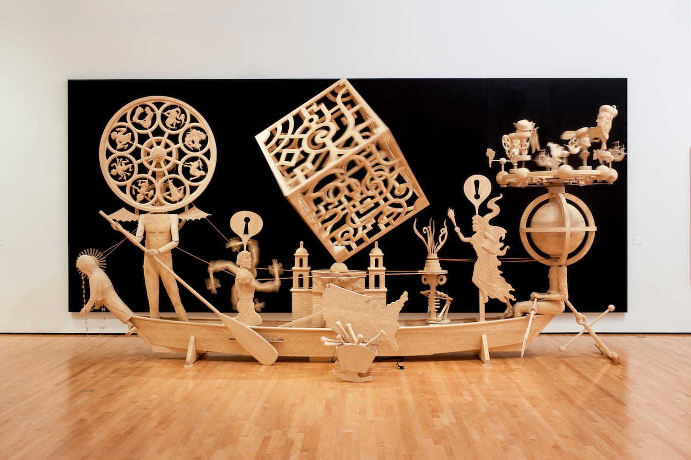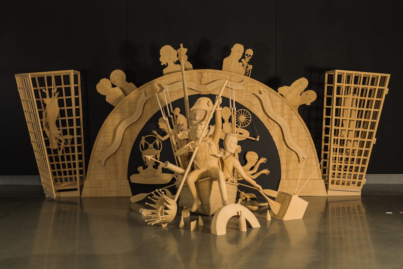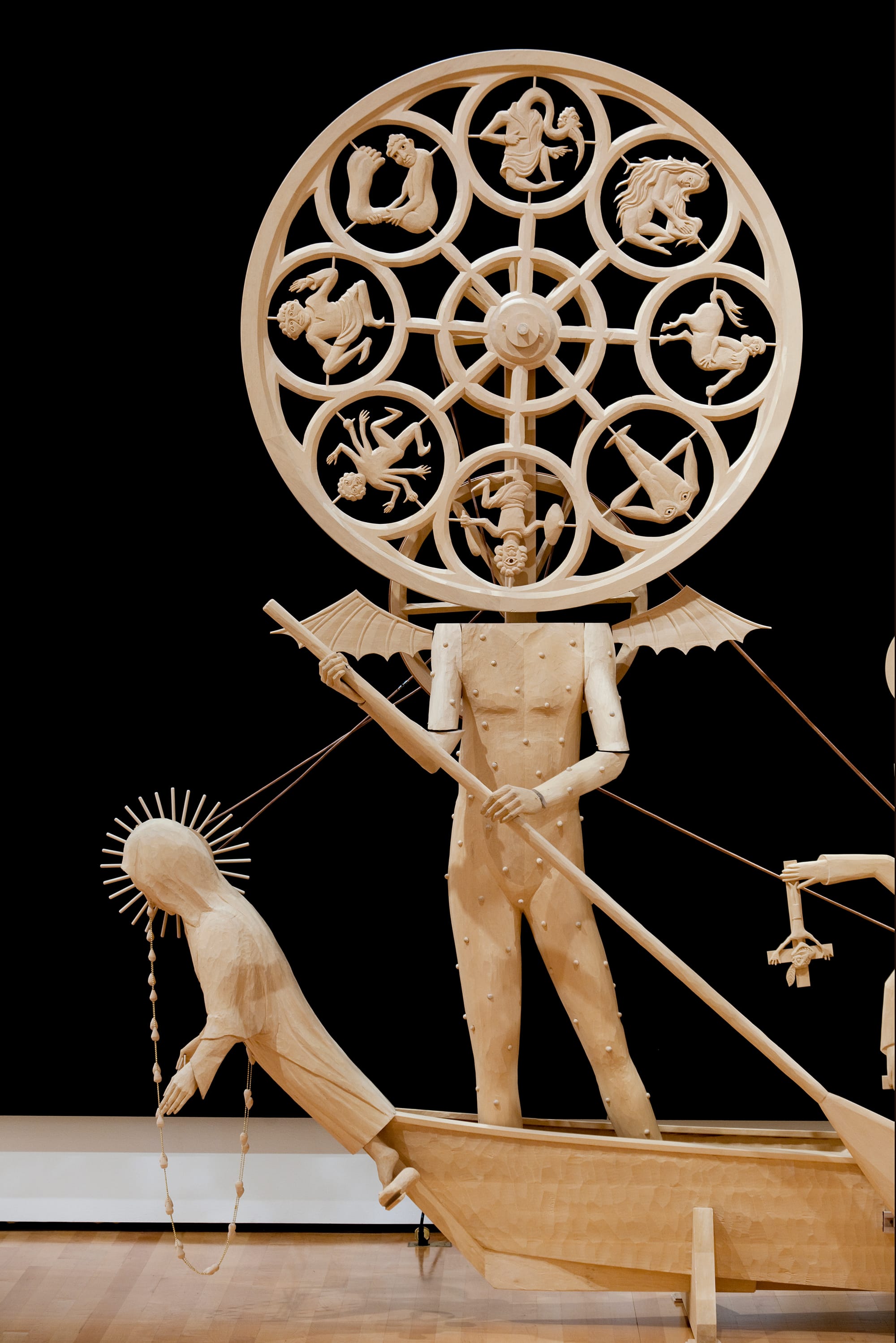 OMAHA, Nebraska — Over the past decade, John Buck has been quietly honing his ability to breathe life into sculpture, carving automata of increasing scale and complexity. Kinetic, at the beautifully renovated warehouse space Kaneko in Omaha, Nebraska, is an expansive semi-retrospective of Buck’s career. Featuring 55 works it spans freestanding sculptures, wall reliefs, and woodblock prints. However, the focus of the exhibition is on Buck’s ambitious kinetic installations (15 are included), many of which are excoriating indictments of the current political administration.