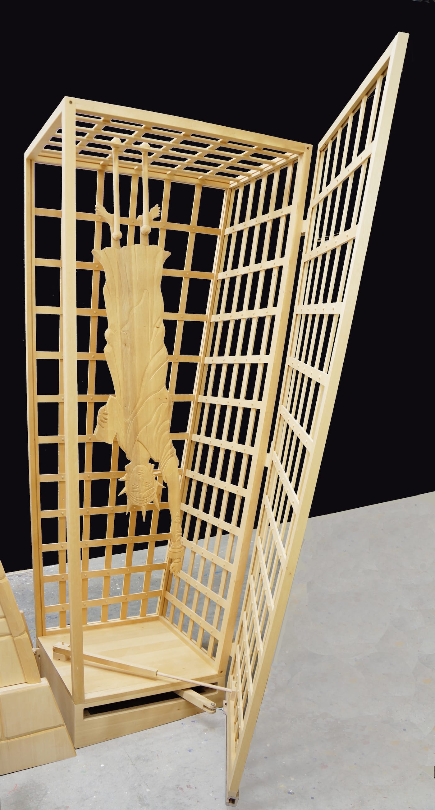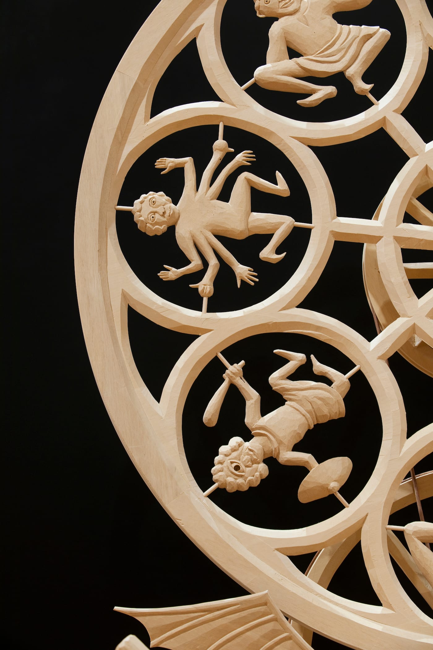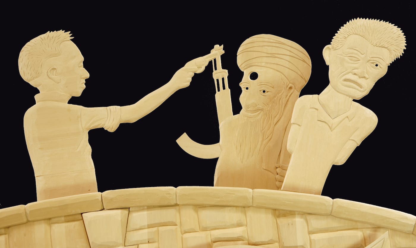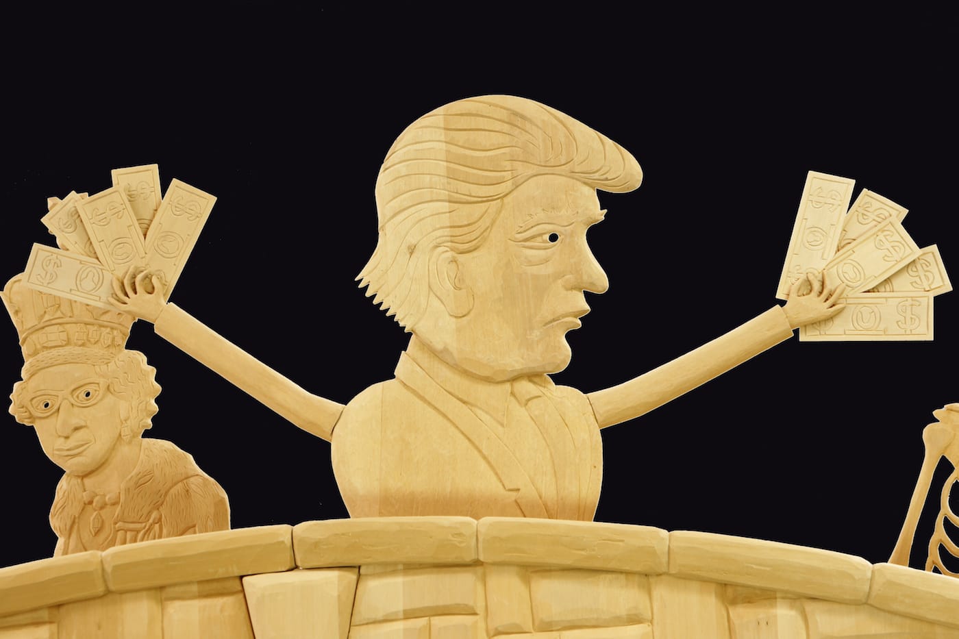 OMAHA, Nebraska — Over the past decade, John Buck has been quietly honing his ability to breathe life into sculpture, carving automata of increasing scale and complexity. Kinetic, at the beautifully renovated warehouse space Kaneko in Omaha, Nebraska, is an expansive semi-retrospective of Buck’s career. Featuring 55 works it spans freestanding sculptures, wall reliefs, and woodblock prints. However, the focus of the exhibition is on Buck’s ambitious kinetic installations (15 are included), many of which are excoriating indictments of the current political administration.