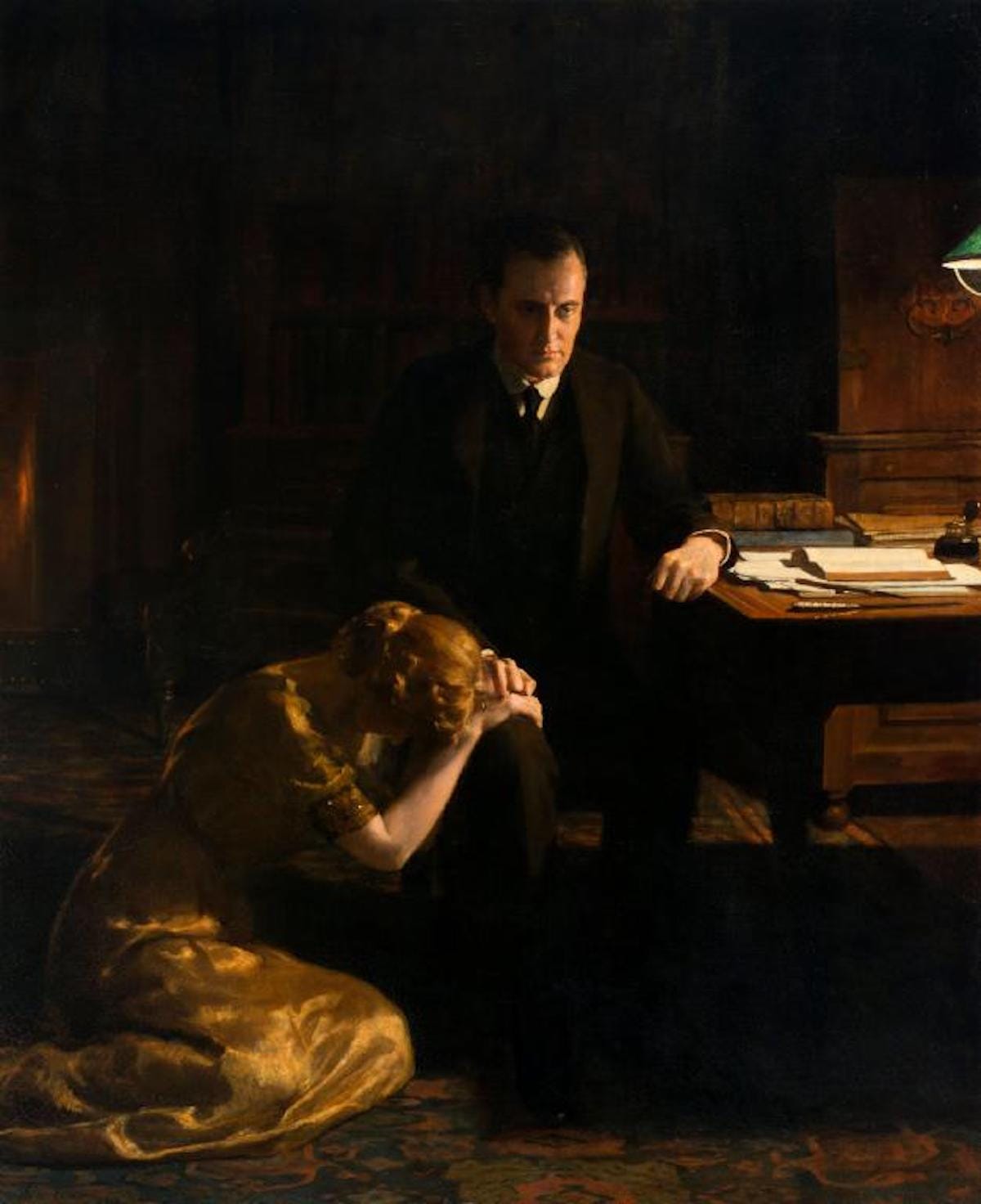 A successful portraitist in the late 19th and early 20th centuries, Collier painted in a Pre-Raphaelite style and was especially drawn to illustrating scenes circulating around mysterious social narratives that encouraged speculation and fueled debate amongst audiences. Known as "problem pictures," the paintings focused on characters caught in moral dilemmas that incited gossip amongst curious viewers as though they were real scenes. Notable examples of these works by Collier included "The Prodigal Daughter" (1903) and "A Fallen Idol" (1913), which both feature women caught in incomprehensible predicaments that inspired viewers to imagine possible explanations behind the perplexing scenes.
