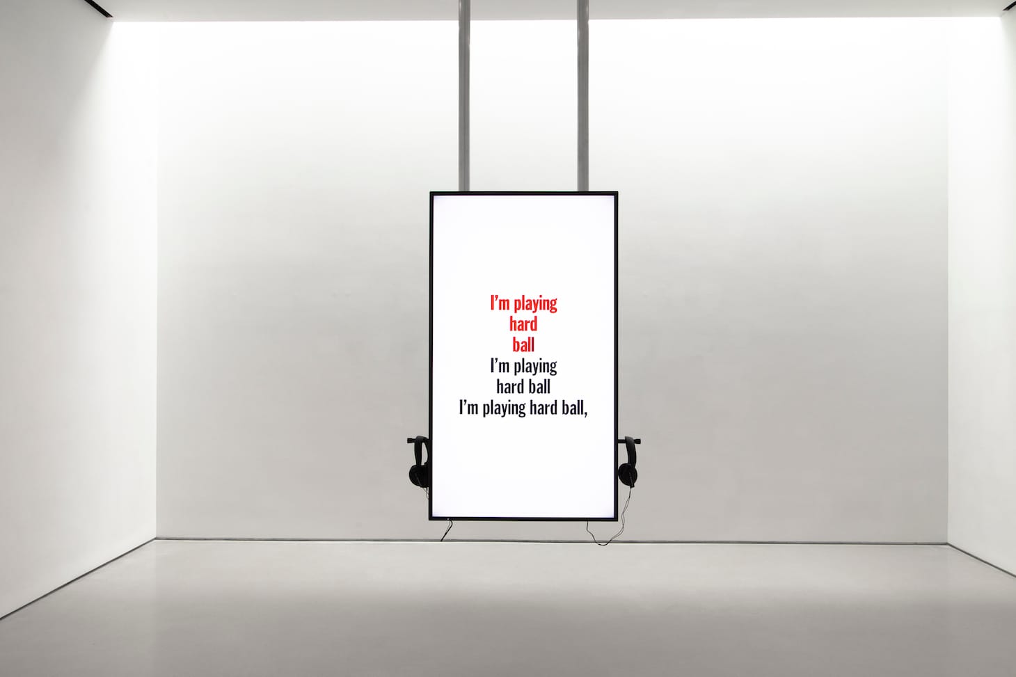 I was reminded of this early experience when I went to John Giorno at Sperone Westwater (March 25–May 28, 2021), his first posthumous exhibition, and listened to recordings of him reading two long poems, “Eating the Sky” (1978) and “I Don’t need it, I don’t want it, and You Cheated Me Out Of It” (1981), which scrolled by on the double-sided flat-screen monitor, accompanied by headphones to listen to the recordings.