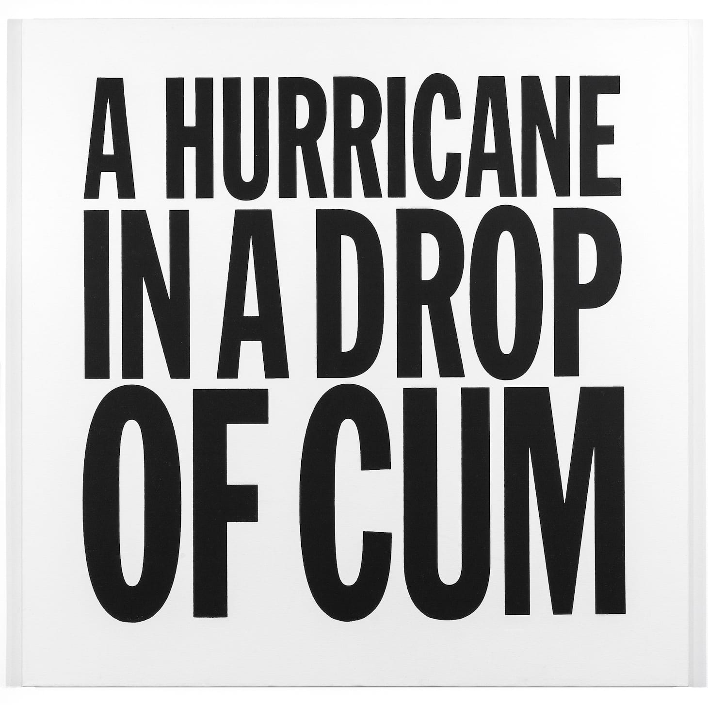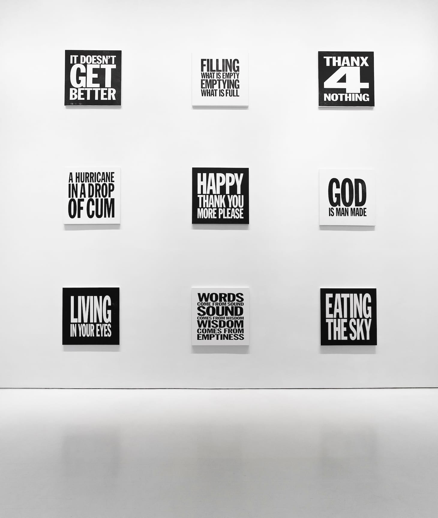 In the first-floor gallery we see an installation of 12 of Giorno’s square, silkscreened, black and white paintings (all 48 by 48 inches and dated between 2011 and 2018) — three on one wall and a grid of nine on another wall, each with a phase from one of his poems printed in the clean trademark font that Mark Michaelson developed for him in 1984.