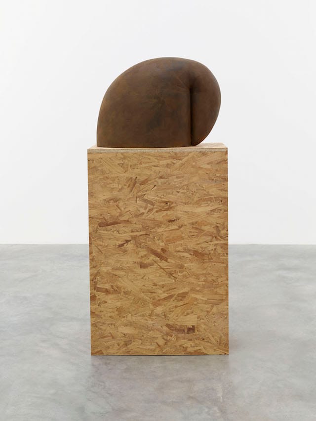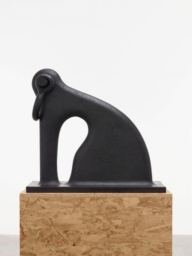 In the cast ductile iron sculpture, “Up and Over” (2014), a curving, seemingly soft form rises up, while leaning forward slightly, until it suddenly flops over, at once clownish and futile. The combination of hard material and soft appearance of “Up and Over” underscores the contradiction that is basic to the form. It can neither overcome its material status nor defy gravity.