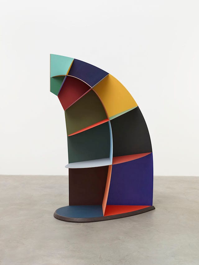 In the two-sided sculpture “Faux Vitrine” (2014), which resembles a display case bending over, as if pulled by its own gravitational force, Puryear has made a piece with shelves that changes radically as we walk around it. The polished steel on one side mirrors and breaks up our reflection, while the painted shelves on the other side face away, seemingly unaffected by the mirror-like surfaces. There is neither an ideal vantage point nor any continuity in “Faux Vitrine.”