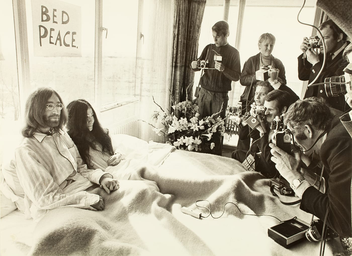 By contrast, for their honeymoon, Lennon and Ono headed to Amsterdam. There, they checked into the Hilton Hotel for what they billed as a week-long “Bed-In for Peace,” opening their room to the press. After the scandal that had ensued from the couple’s appearance, in the nude, on the cover of Two Virgins, reporters expected to catch the newlyweds in flagrante delicto — but instead found them sitting in bed, in their pyjamas, earnestly calling for an end to all war and discussing non-violent methods of achieving peace. Years later, Lennon told Rolling Stone, “We decided that if we were going to do anything like get married that we would dedicate it to peace.”