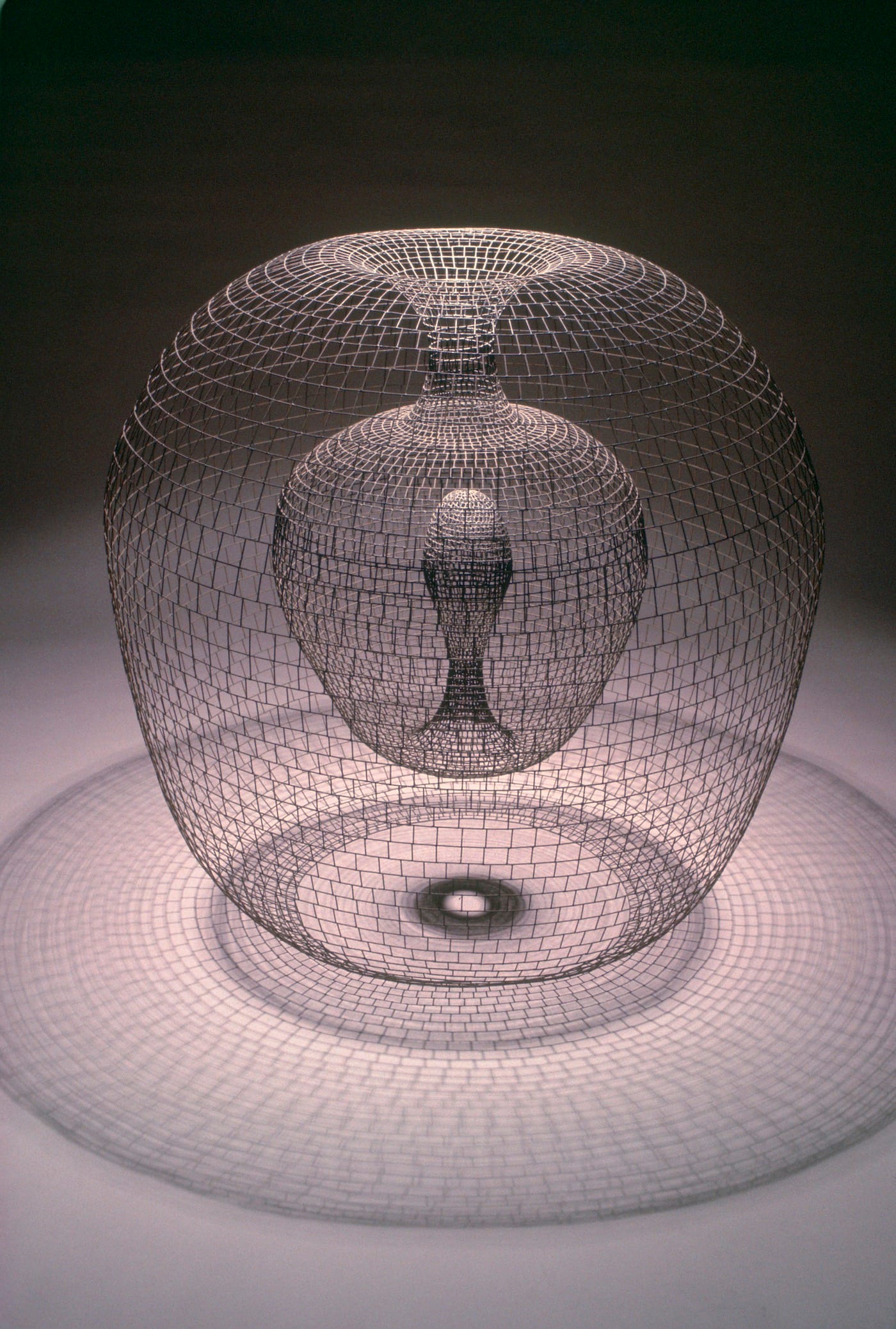 Pai’s process is slow and incremental, literally one line at a time. Many of his pieces consist of open grids made of thin steel rods welded together. The grids seem capable of attaining any contortion, torque, or change in size. A number of open, self-contained, freestanding works are composed of a form inside a form inside a form, all made from the same bending, folding, curving plane. The only equivalents I can think of are three-dimensional computer graphics, perhaps theoretical models of a black hole or an imploding galaxy.