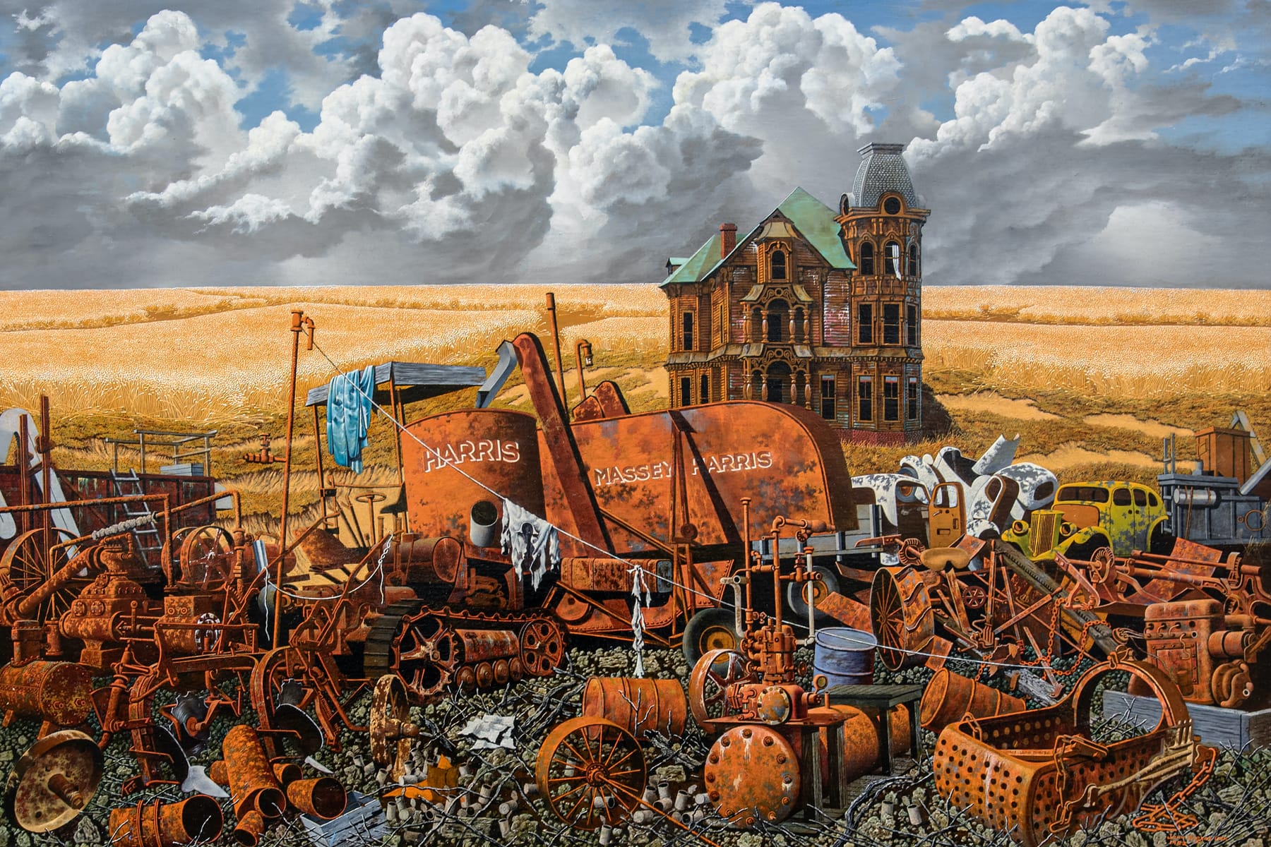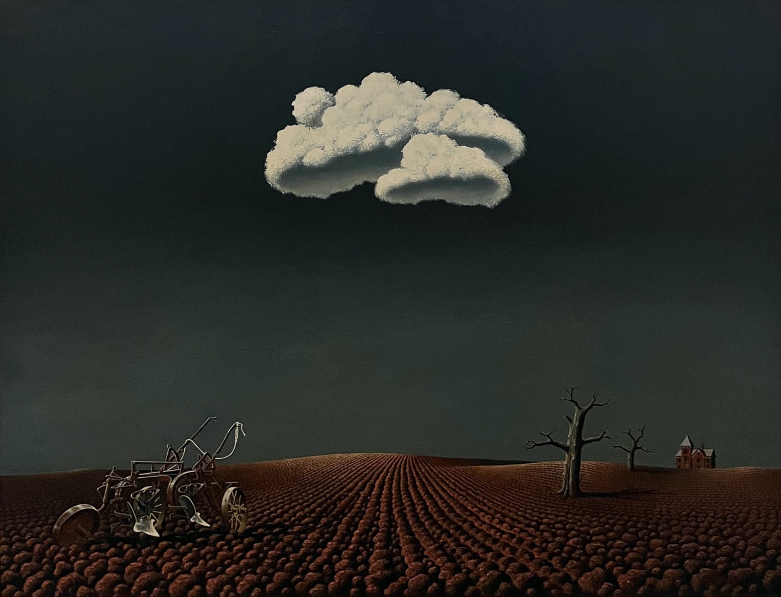 In the lower right of the barren field, composed of vertical rows of brown, rotted vegetables receding into the distance, Cox has depicted an abandoned plow. On the other side of the field are two bare, leafless trees and a gothic mansion rising from behind the horizon line. That diagonal pulls our attention across and into the pictorial space, culminating in an unwelcoming building with dark, curtainless windows, that seems out of place. A number of observers have described the clouds as a sign of hope, but they do not mention that the painting was made at the height of World War II, when collective anxiety was high. The luminous clouds — fluffy, empty shells — and the dark, foreboding sky seem to exist in different realities. This hardly appears to be a vision of hope.