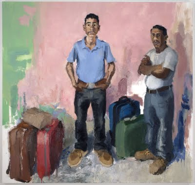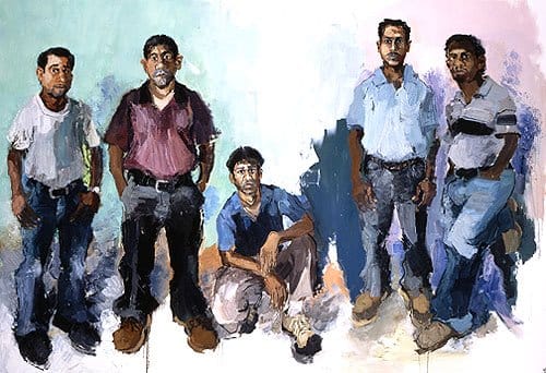 Gabriel Barajas (left) was from 1995–2001 Sonsini’s only subject. Today, Barejas chooses many of Sonsini’s models, men he knows or has met on the streets of Los Angeles county looking for work. Sonsini understands the importance of what he documents in his art, though he has never set out to make any particular statement. Instead he allows the men to speak for themselves, their emotion taking center stage. Some of Sonsini’s paintings are of single figures and others highlight a group of men standing or sitting. The political undertones in Sonsini’s works cannot be missed, though Sonsini would say “painting a portrait is already political.” In one interview, the artist explained his portraits this way, “For me painting the portrait is about recreating the sensation of presence, the experience of having the sitter in my studio.”