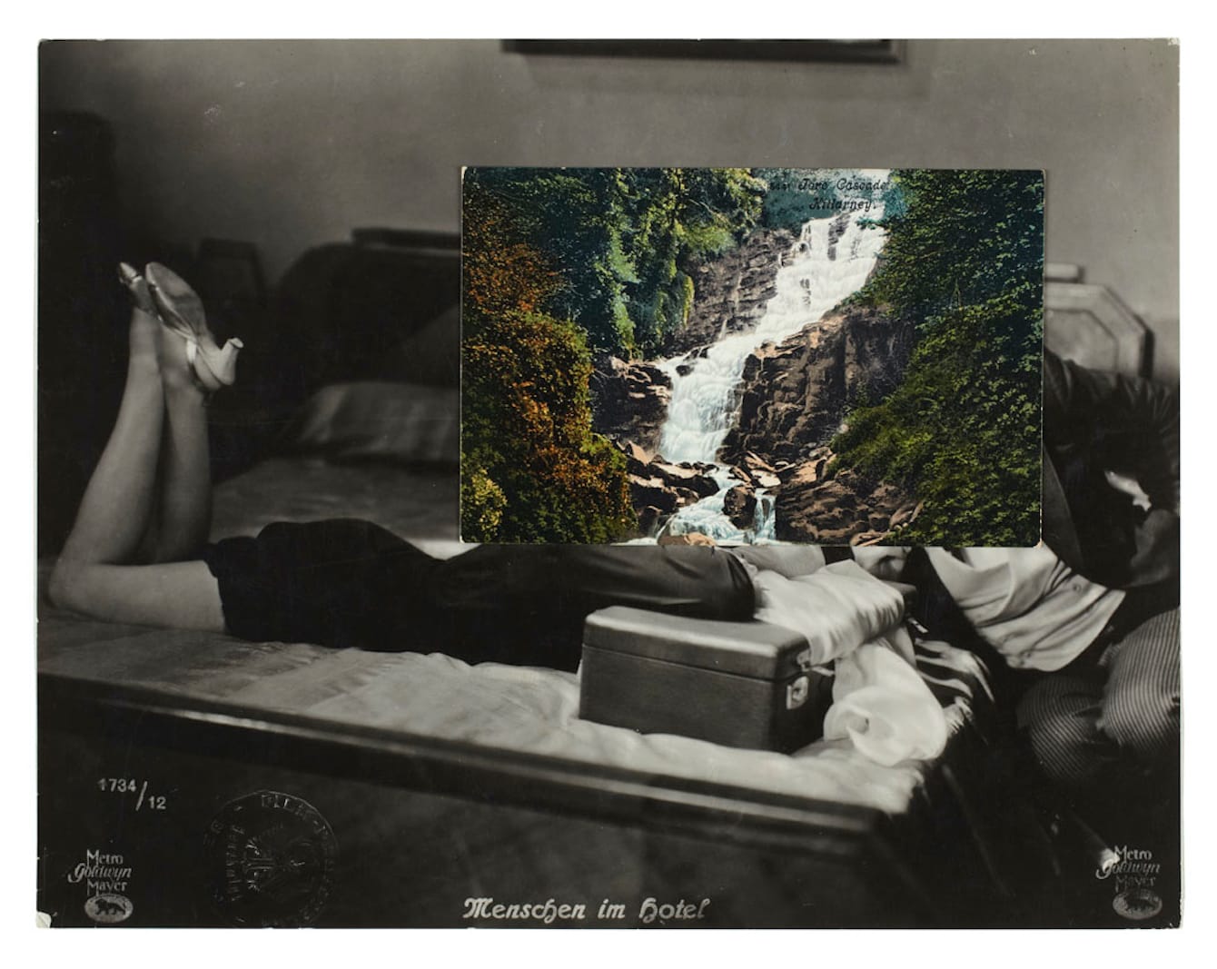 Where did — and does — his image bank come from? Like Max Ernst, he generally goes for images that antedate his own life span — a still from a German film of the 1940s, and even older postcards from nature, perhaps — the rushing of a waterfall, for example. He likes obliteration — of an entire face, for example, one image blinding another.