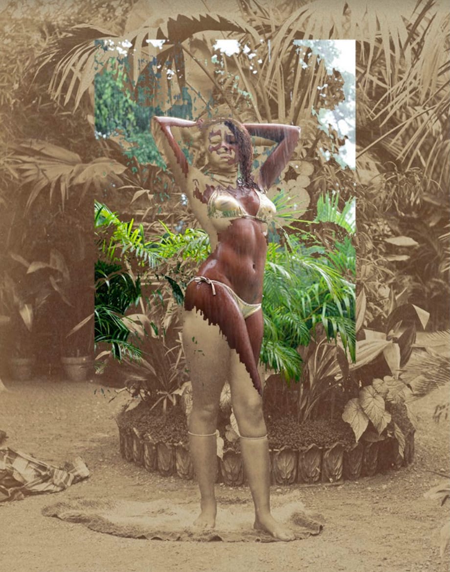 In digital collages such as “Continuum” (2020) — on view in her latest exhibition at Baxter Street at the Camera Club of New York — Minaya imposes Google image search results of Dominican women, often in highly eroticized poses, onto historic photographs taken by colonial ethnographers. Weaving historic and contemporary images, she remixes and collages snippets of postcards sold in tourist shops in Santo Domingo, then slips them back into shops throughout the city, covertly intervening into the circulation of images designed for consumption.