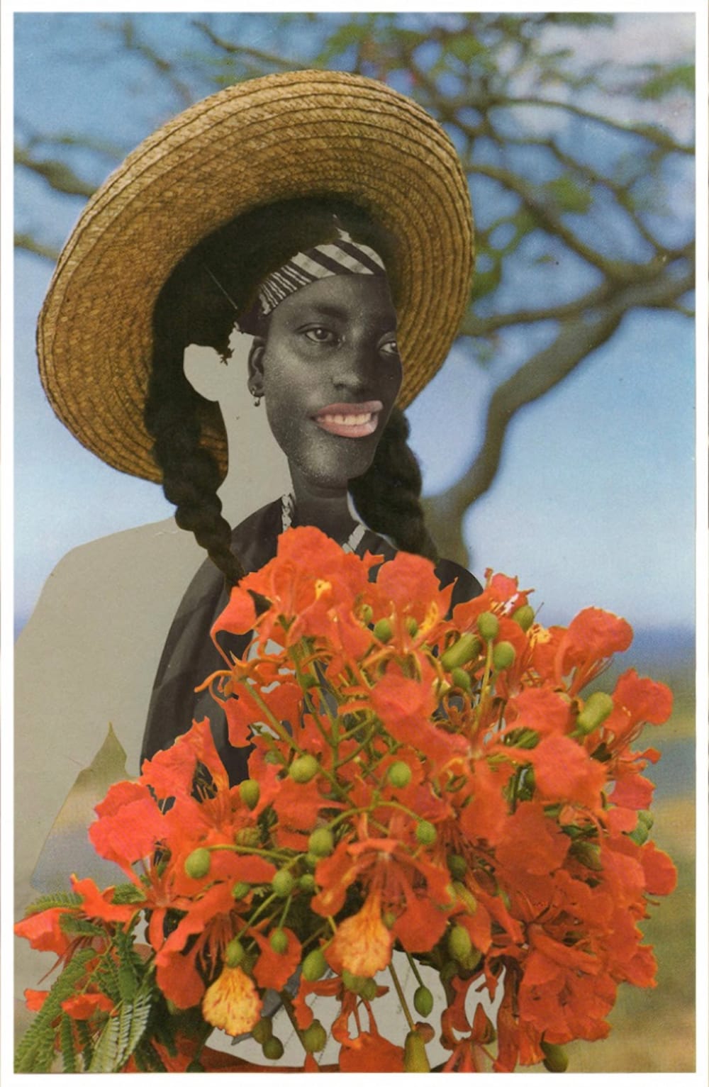 Tensions — of beauty, desire, fact and fantasy, agency, and stereotypes — are further exemplified in works such as “Ayoowiri / Girl with poinciana flowers” (2020). These beautiful orange flowers, native to the Caribbean, carry a historical legacy: once used as abortifacients by enslaved women, they offered resistance to a plantation economy that depended on their reproductive labor.