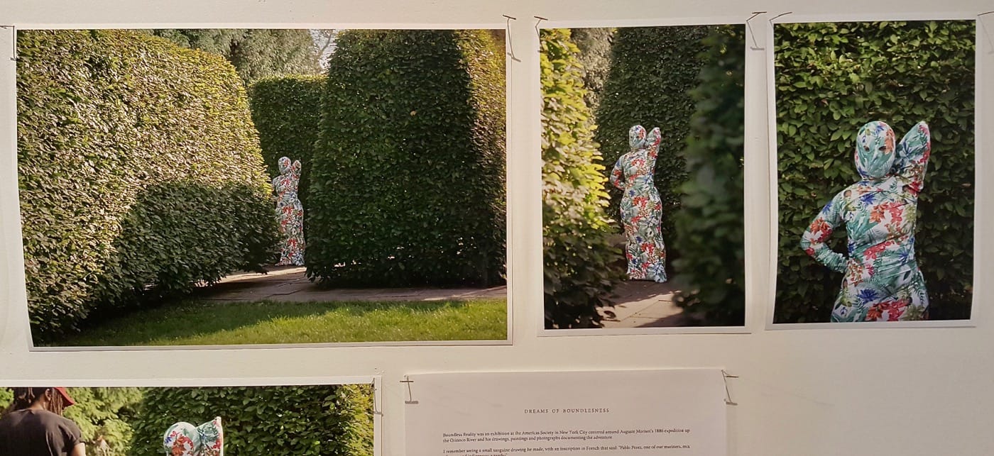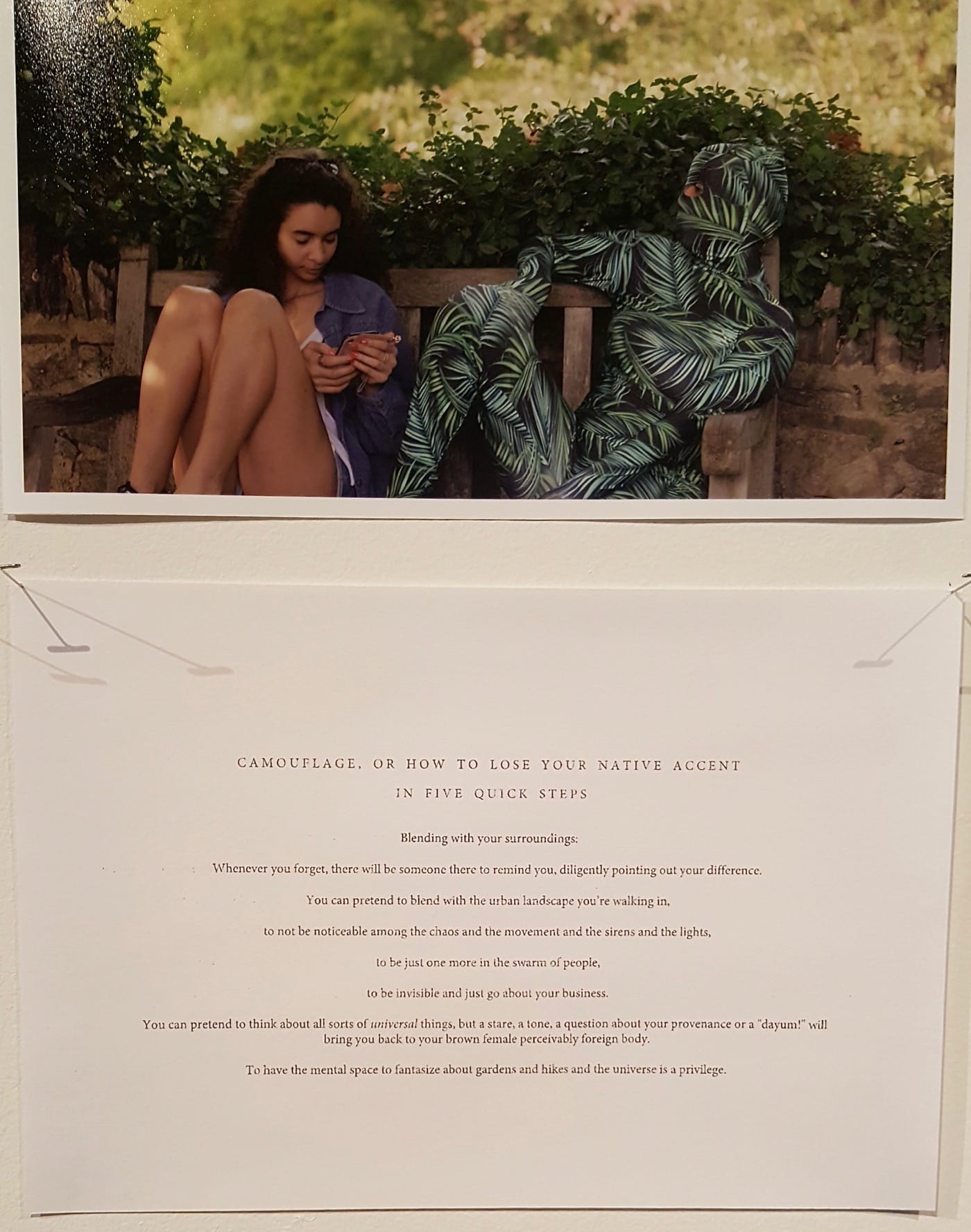 Joiri Minaya, who describes herself as a Dominican-American artist, has developed performance work that sometimes starkly, sometimes playfully, and always discerningly teases out strategies for maintaining equilibrium in the midst of this quandary. In a small group show, Historical Amnesia, mounted at BronxArtSpace, Minaya presents her piece “Containers” (2017) color photographs along with poetically descriptive texts, all of which are tacked to the wall with T-pins to form a largish documentary storyboard of a performance at Wave Hill cultural center. (Historical Amnesia was curated by Gabriel de Guzman who also presented Minaya’s work at Wave Hill.) The performers, all Dominican women, Eilen Itzel Mena, Cristina Alvarez, Ivonne Tejada, and Paola E. Mateo wear large flora-patterned almost skin-tight bodysuits that cover their entire bodies. Minaya designed the garments and loosely choreographed the performances to allow the women to move in and out of the body suits, interact with visitors, pose, and rest from posing — actions coordinated with an audio track. Seen in these suits the performers are both wild and pliant: photographed sitting on a bench or lying on a garden’s ground, interacting with a group of children, or standing among a copse of topiarian trees. A text headlined “CAMOUFLAGE, OR HOW TO LOSE YOUR ACCENT IN FIVE QUICK STEPS” indicates that despite “Blending in with your surroundings … there will be someone there … diligently pointing out your difference.” Another text points to what happens when the lesson of this question (which inevitably seeks to put or keep one in a certain place) is taken to heart: “A lot of being racialized is about explaining. Where are you from? What kind of fruit? A strange fruit.” Another text pulls away the rug to reveal the trap door under the reader’s feet: “I’m not a flower, I’m only here to work. I’m here to entertain you, but only during my shift.”