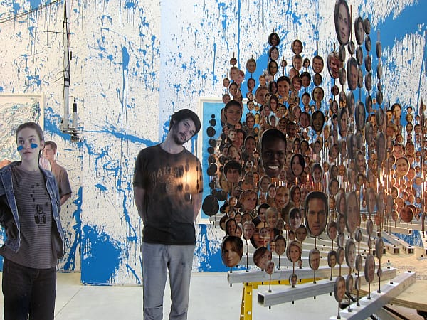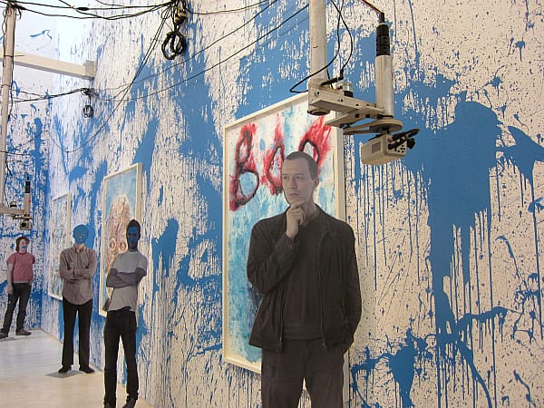 The feral splatters of blue paint across the wall add to the sensory assault and seem like manifestations of the roving movements of the cameras that observe you around the gallery. A carousel of faces sliced from magazines offer another visual for the televisions, and another camera turns inside a miniature version of the gallery, which is lined with small versions of the two-dimensional works on the wall: collages slapped with blue paint. When you look closely at these collages, you find more faces ripped from magazines staring back. The sky-blue color serves to connect everything together into a singular piece.