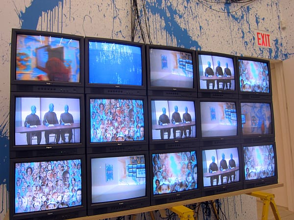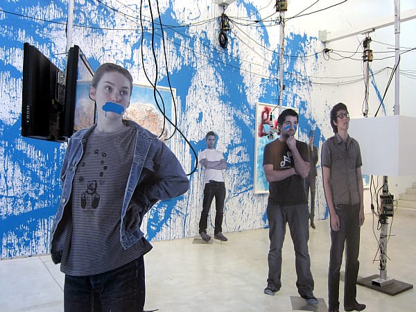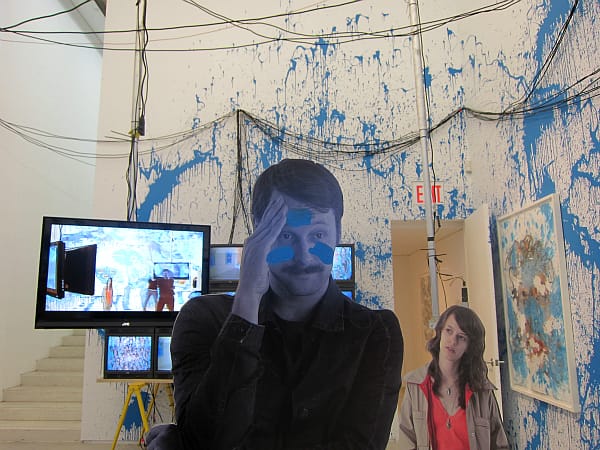The Blue Period is a disorienting spectacle. Once in The Blue Period, you quickly realize you are being filmed for the stack of televisions streaming footage from the gallery alongside film and TV clips of people painted blue. (Tobias in the Arrested Development TV serial, the Blue Man Group and the end scene of Jean-Luc Godard’s 1965 film Pierrot le Fou make appearances.) But you are not the only star of the gallery show. In fact, it’s rather crowded with young, ponderous people, life-size figures who are two-dimensional, but, through the flattening of the video screens and the tricks your eyes play, can be mistaken over and over for the real thing.